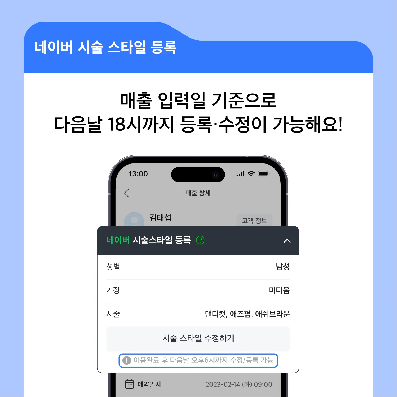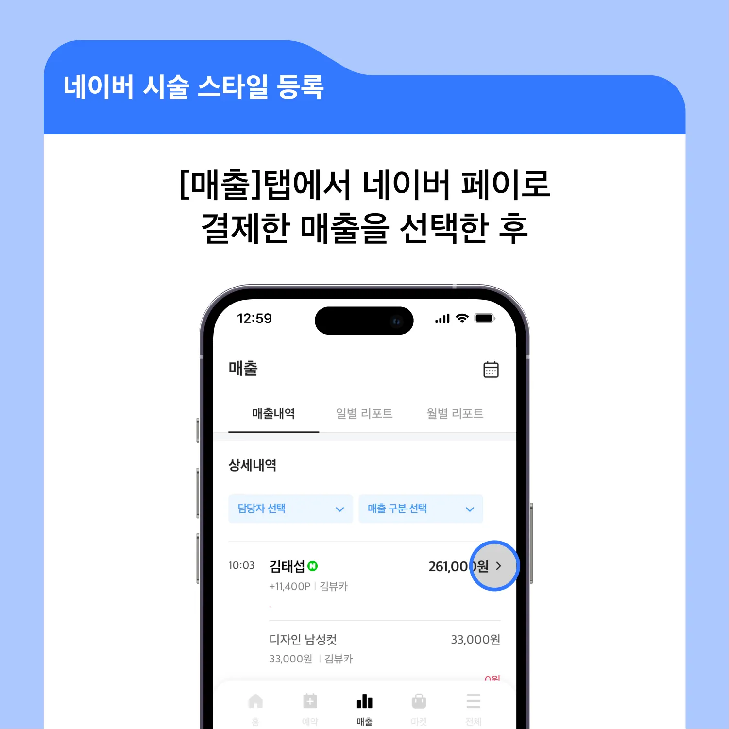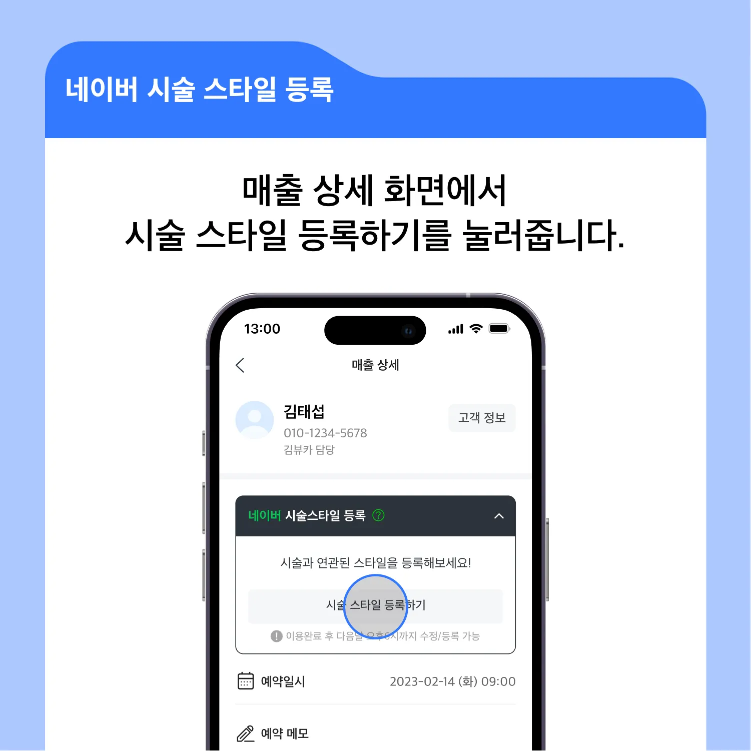 매출 상세 화면에서 시술 스타일 등록하기 버튼을 눌러줍니다.