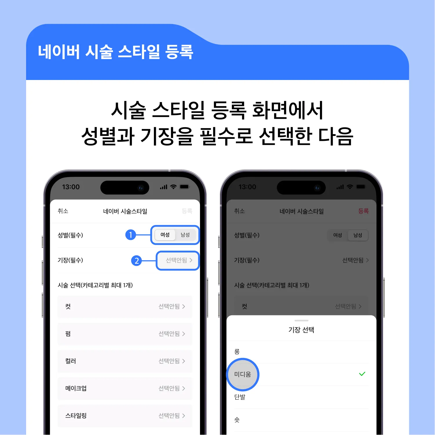 시술 스타일 등록 화면에서 성별과 기장을 필수로 선택한 뒤