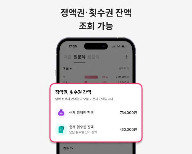 정액권&횟수권 잔액 확인, 일별・월별 객단가 확인 항목이 추가되었습니다.