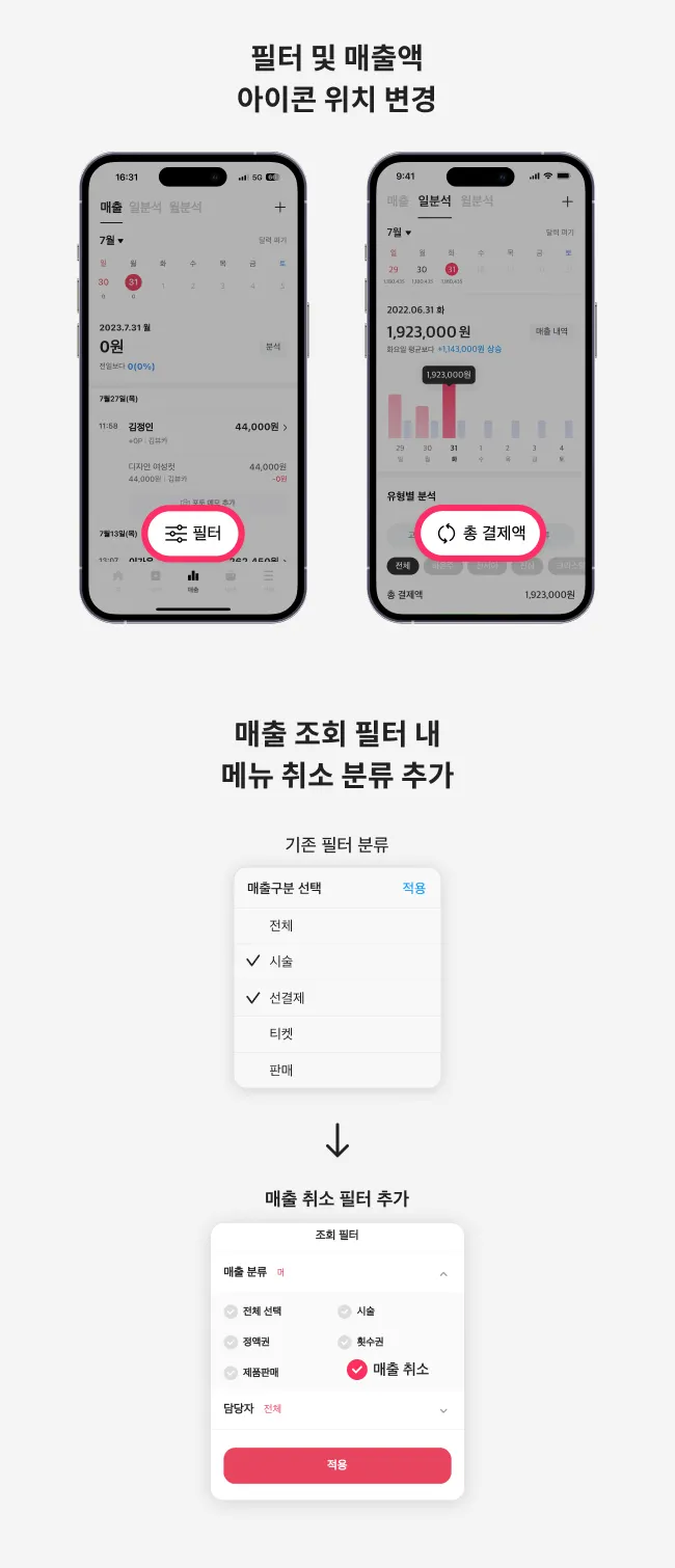 매출 화면 위에 있던 조회 필터와 매출액(=총매출액・실매출액) 아이콘의 위치가 하단으로 변경되었습니다.