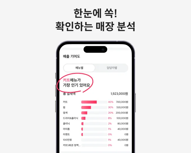앱 업데이트를 진행하시면  메뉴 별 인기 있는 시술, 매출 기여도 비율이 높은 디자이너를 가장 먼저 크게 보여 드립니다.