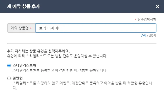 스타일리스트형을 선택하시면 고객이 예약시간과 시술메뉴를 순차적으로 선택후 예약하도록 진행됩니다.일반형을 선택하시면 예약시간 선택후 바로 예약이 완료됩니다. (시술메뉴 선택없음)