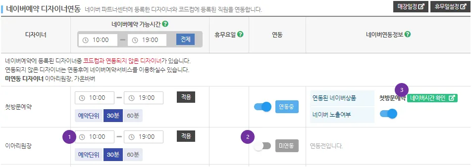 매장연동후에는 직원의 예약가능시간과 휴무일을 네이버예약 페이지에서 직원을 연동해주세요.