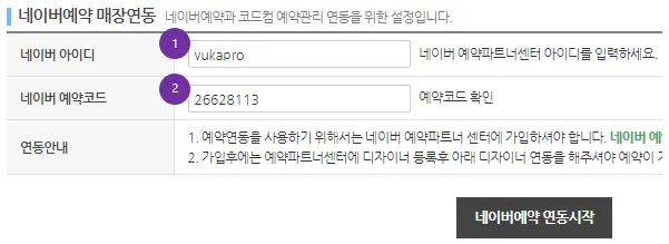 예약 > 네이버 예약 > 네이버 매장 연동설정 페이지로 이동해서 아래 그림과 같이 네이버 아이디와 네이버 예약코드를 입력하세요.