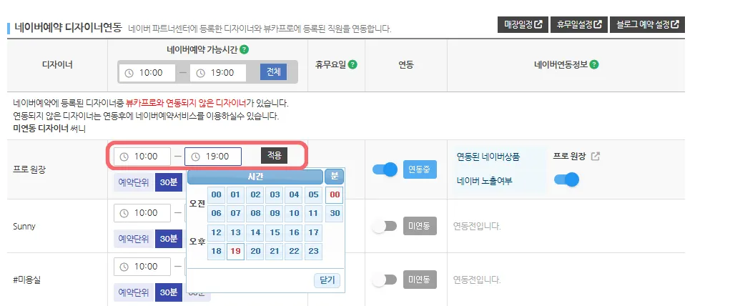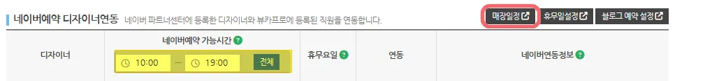 매장연동 후에는 디자이너(직원)와 네이버 예약상품을 연동하고 뷰카프로+에서 예약 가능시간과 휴무일을 설정해주세요.
