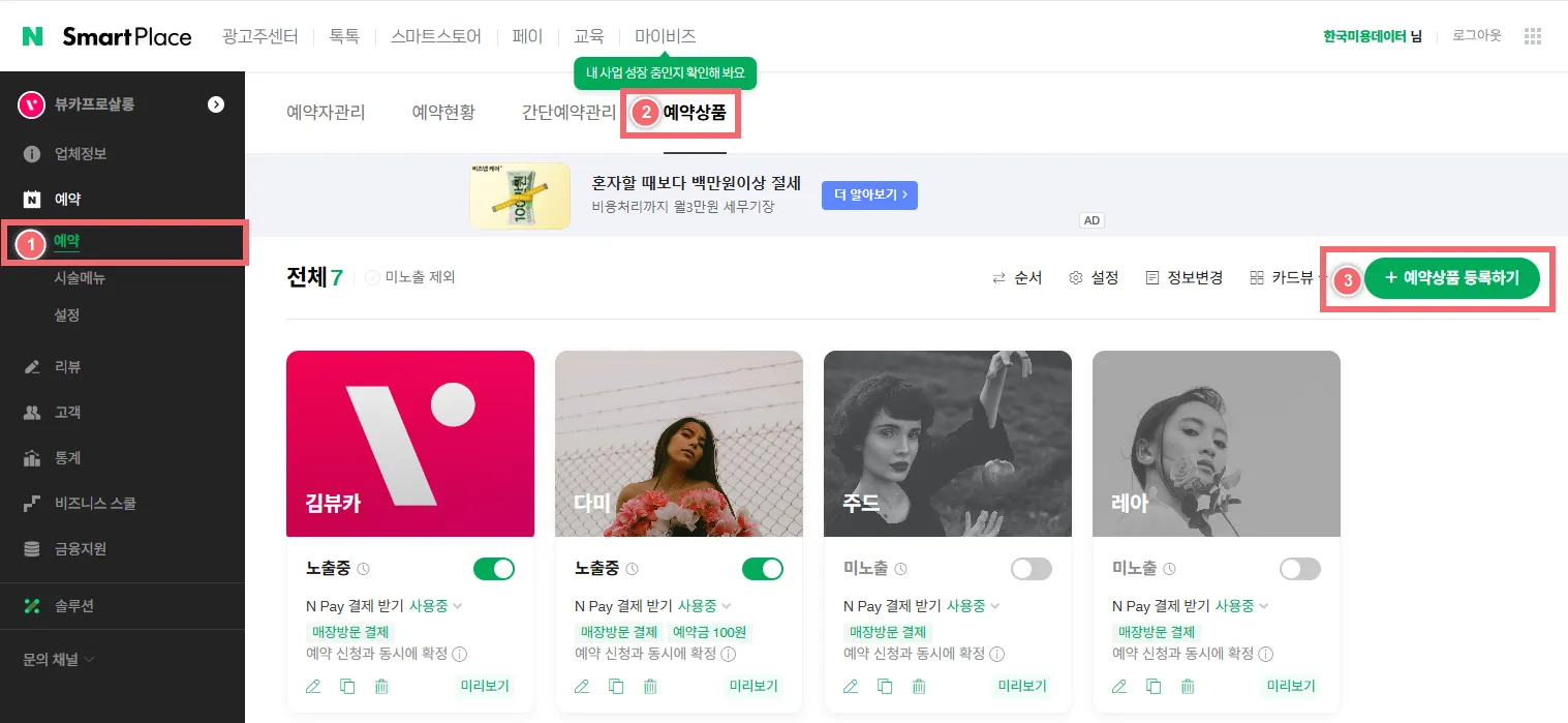 네이버에 미지정이나 첫방문 예약 상품의 노출이 필요한 경우 네이버 예약상품과 연동할 뷰카프로의 직원을 꼭 등록해주세요.