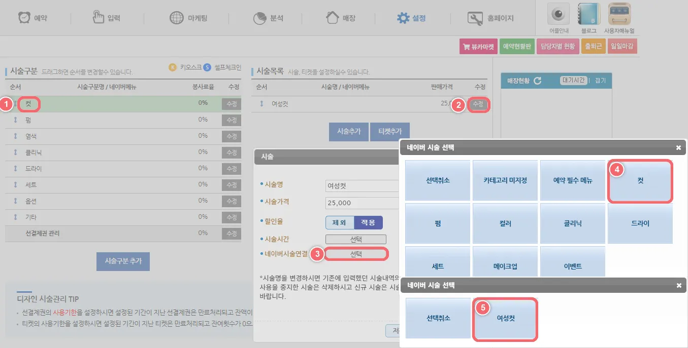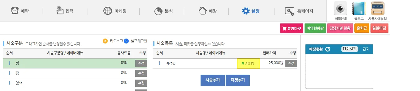 뷰카프로 시술메뉴를 네이버메뉴와 연동하면 매출입력시 고객이 선택한 메뉴가 자동으로 선택됩니다.