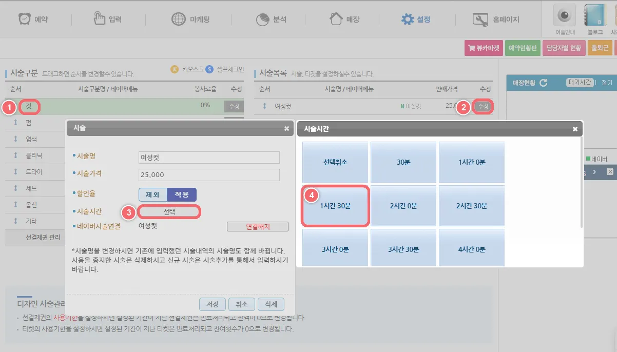 시술시간 설정후 네이버메뉴와 연동하면 시술시간만큼 자동으로 예약불가 처리가 됩니다.