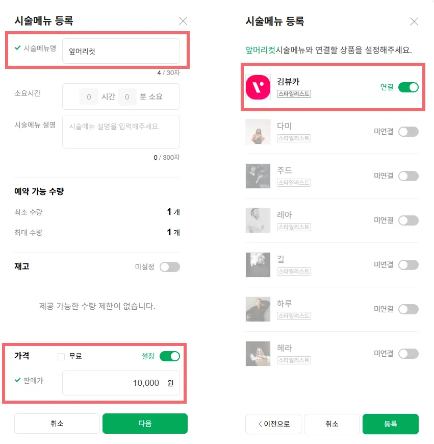 시술메뉴명과 가격을 입력한 후 해당 시술이 가능한 예약 상품을 연결해주세요. (시술 소요시간은 뷰카프로에서 설정 가능합니다.)