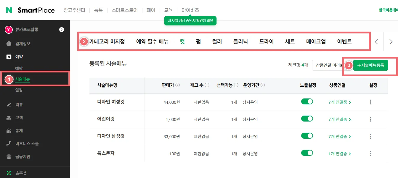네이버 예약 주문 관리에서 시술메뉴를 등록합니다.