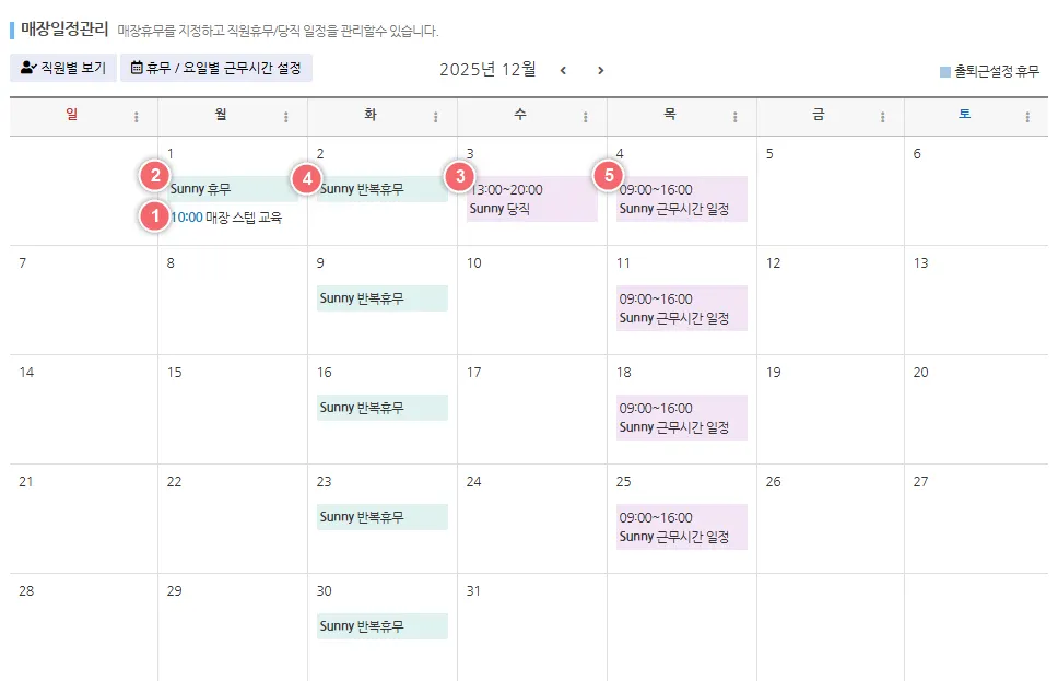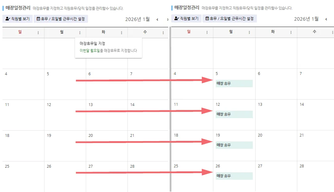 이 기능은 매장(전체 직원)의 휴무를 일괄 등록하지만 한 달씩만 설정 가능합니다.
