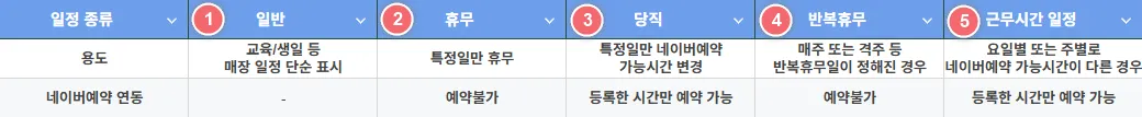 일반 일정 외 설정된 모든 일정은 네이버 예약의 예약 가능/불가 시간과 연동되어 반영됩니다.