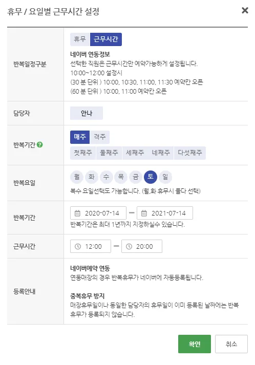 반복휴무는 월요일 휴무와 같이 매주 같은 요일에 쉬는 직원이나 대형마트와 같이 격주로 쉬는 경우 편리하게 사용할 수 있습니다.