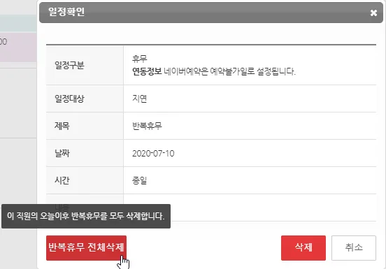 반복휴무나 근무시간 일정은 다수의 휴무일 설정과 근무시간 설정이 한번에 입력되기 때문에 2가지의 삭제처리가 가능합니다.