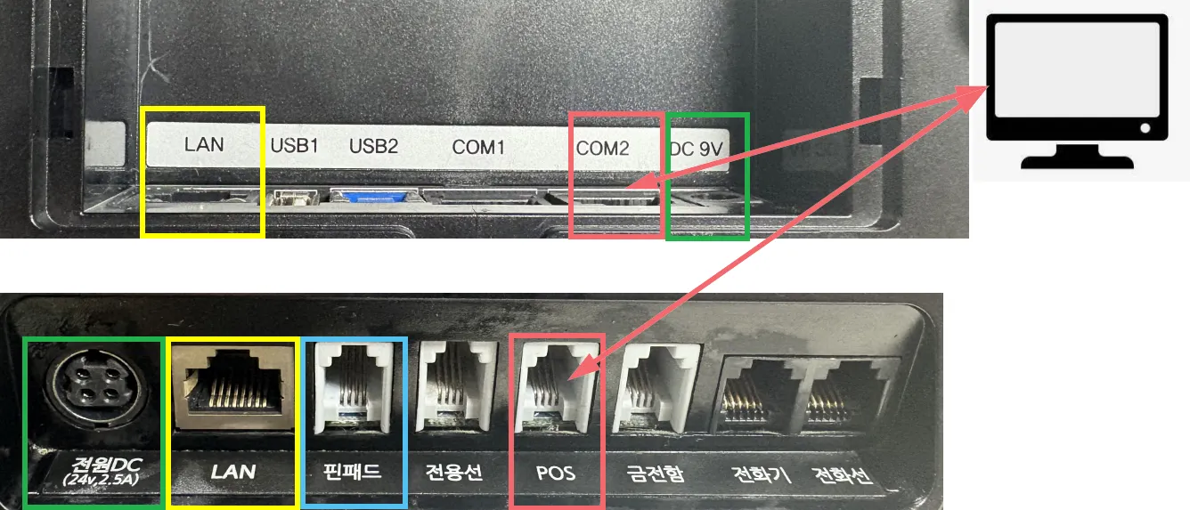 카드단말기와 토스단말기에 각각 LAN 연결