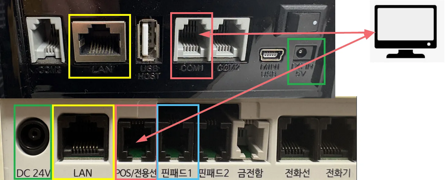 카드단말기의 POS/전용선 과 간편결제 단말기의 COM1을 PC,노트북(USB)에 각각 연결