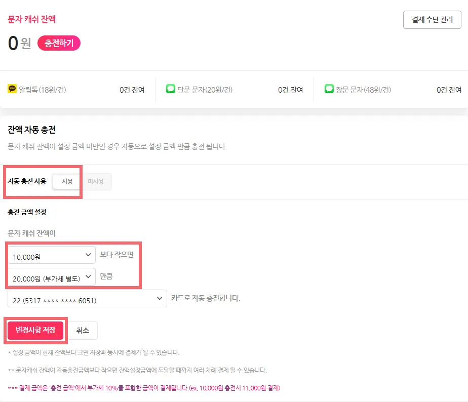 매번 수동 충전이 번거로운 경우, 자동 충전 사용 기능을 설정할 수 있습니다.