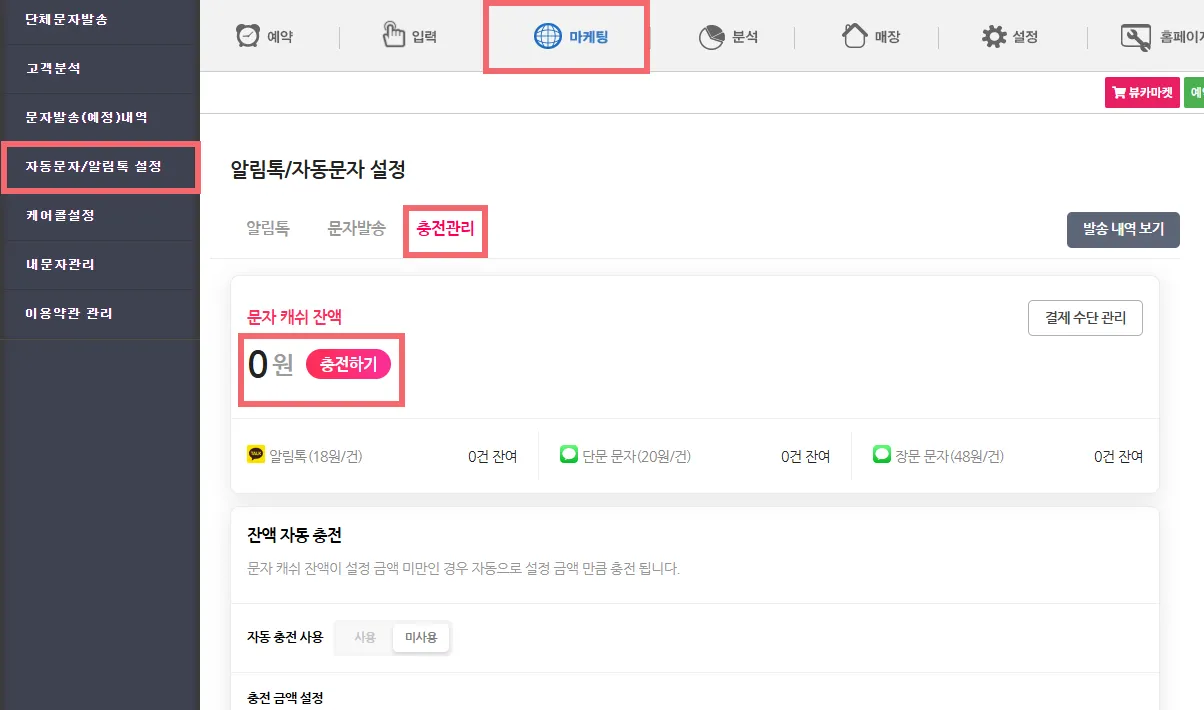 마케팅 > 자동문자/알림톡 발송 > 충전관리 메뉴에서 현재 캐쉬 충전 잔액 확인이 가능합니다.