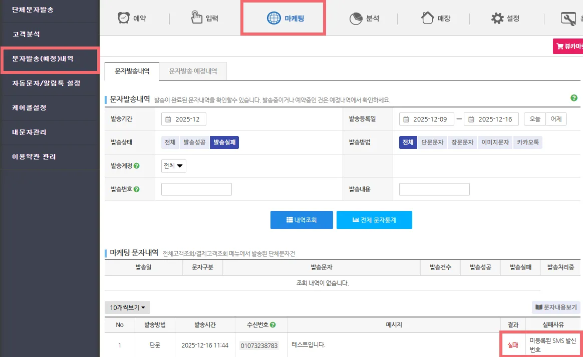 뷰카프로에서 마케팅 > 문자 발송 내역 메뉴에서 상태 확인