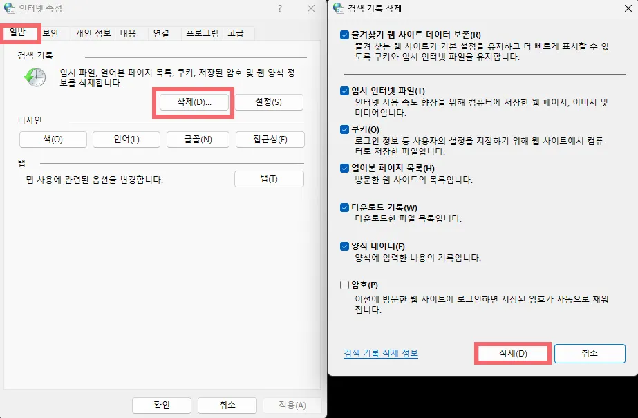 쿠키 삭제 방법 (IE 모드 / 인터넷 옵션)