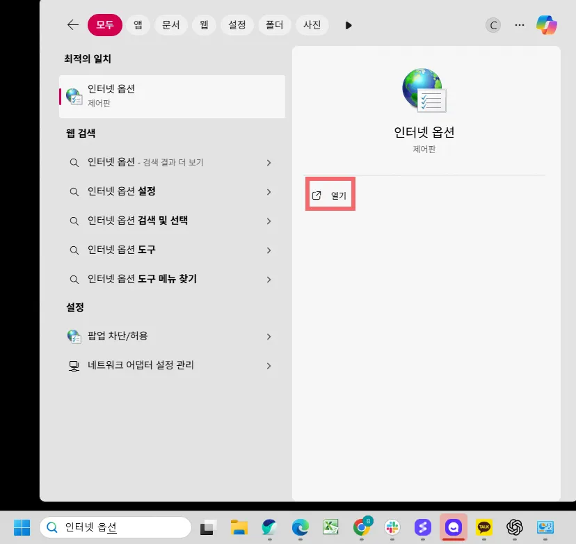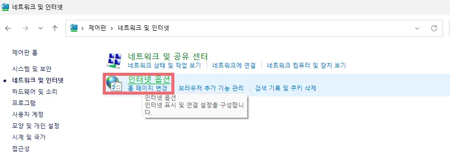 시작 프로그램에서 “인터넷 옵션” 검색 또는 제어판에서 인터넷 옵션 선택