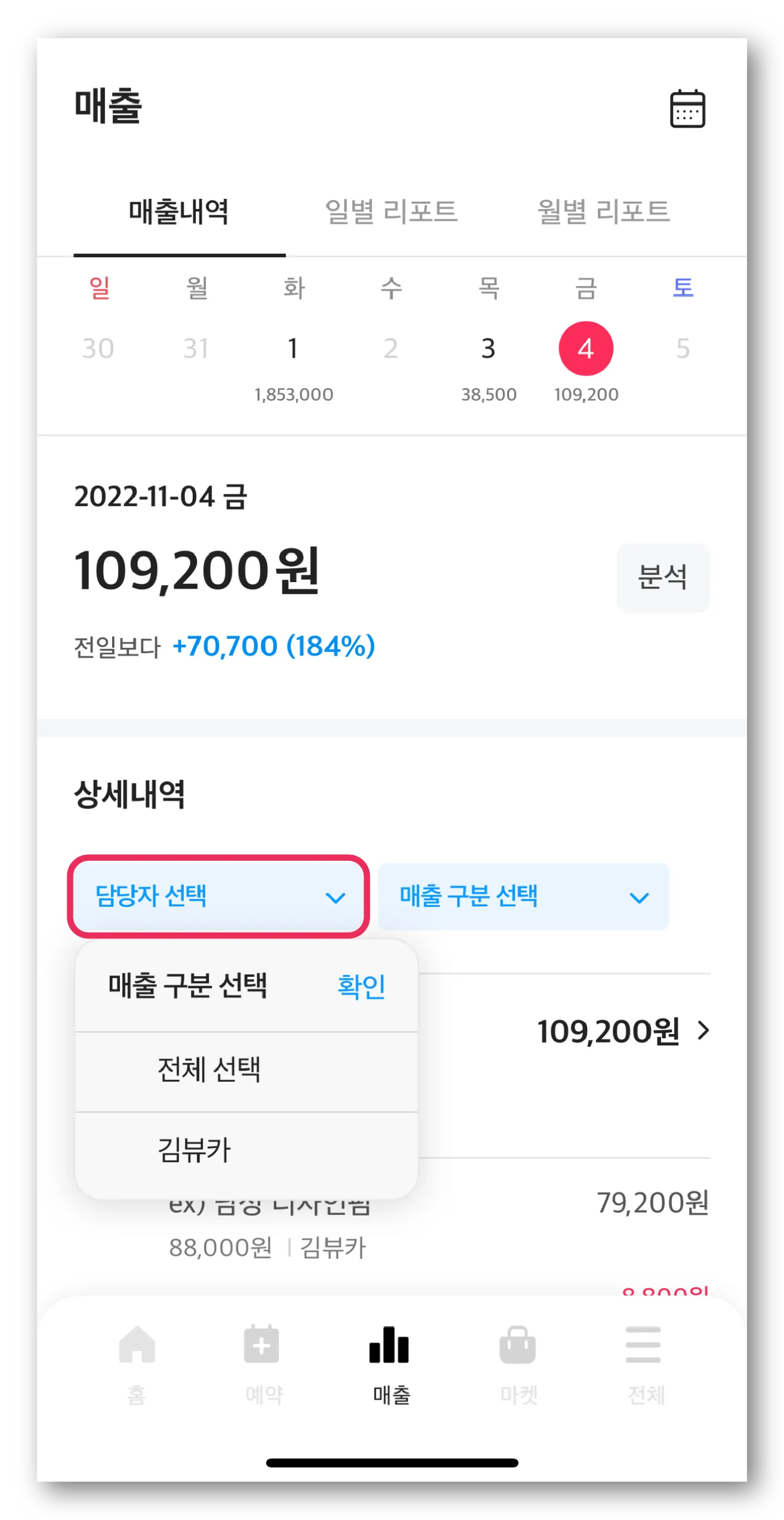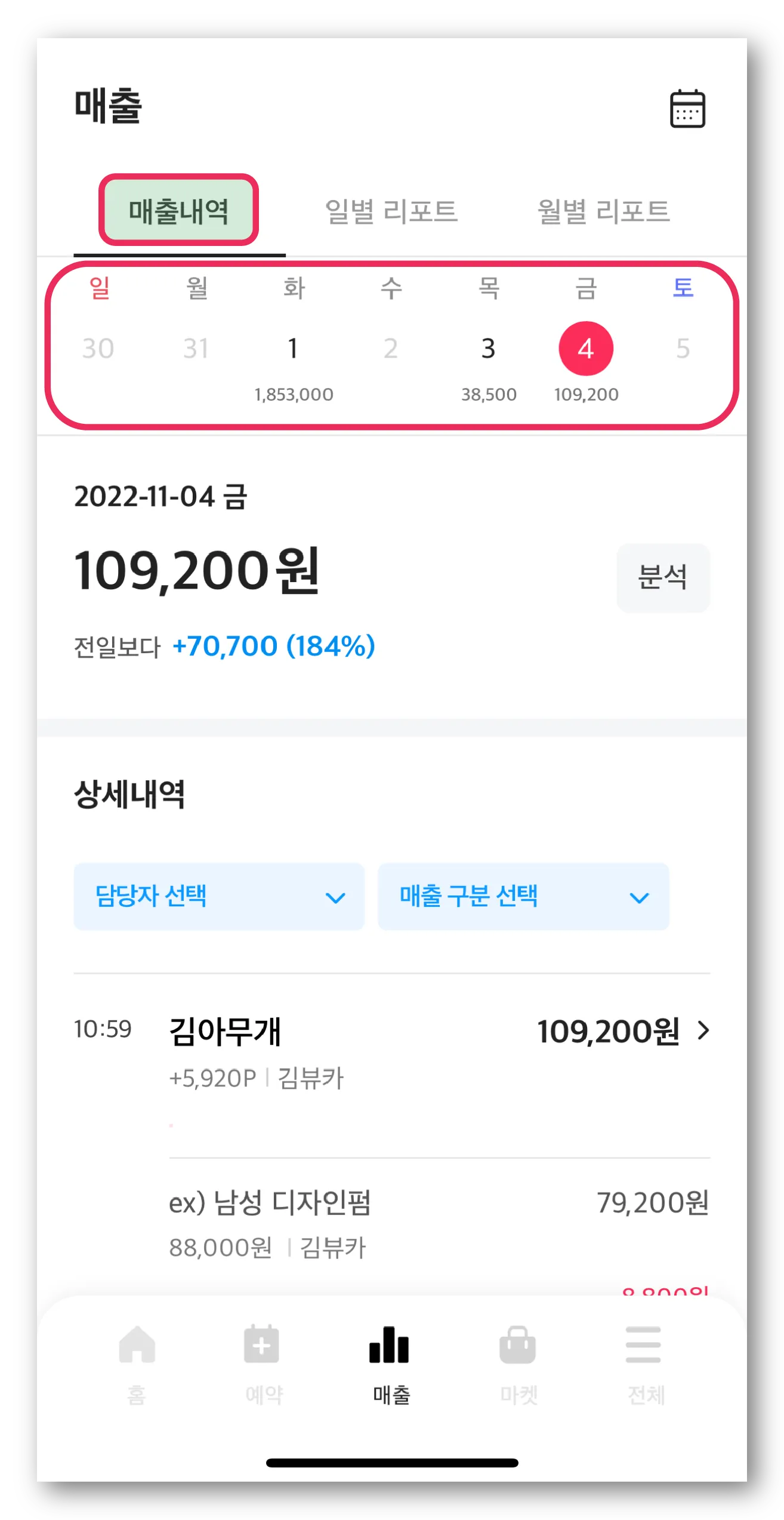 ‘매출 내역’ 탭 아래의 달력에서 매출을 취소할 날짜를 선택해 주세요.