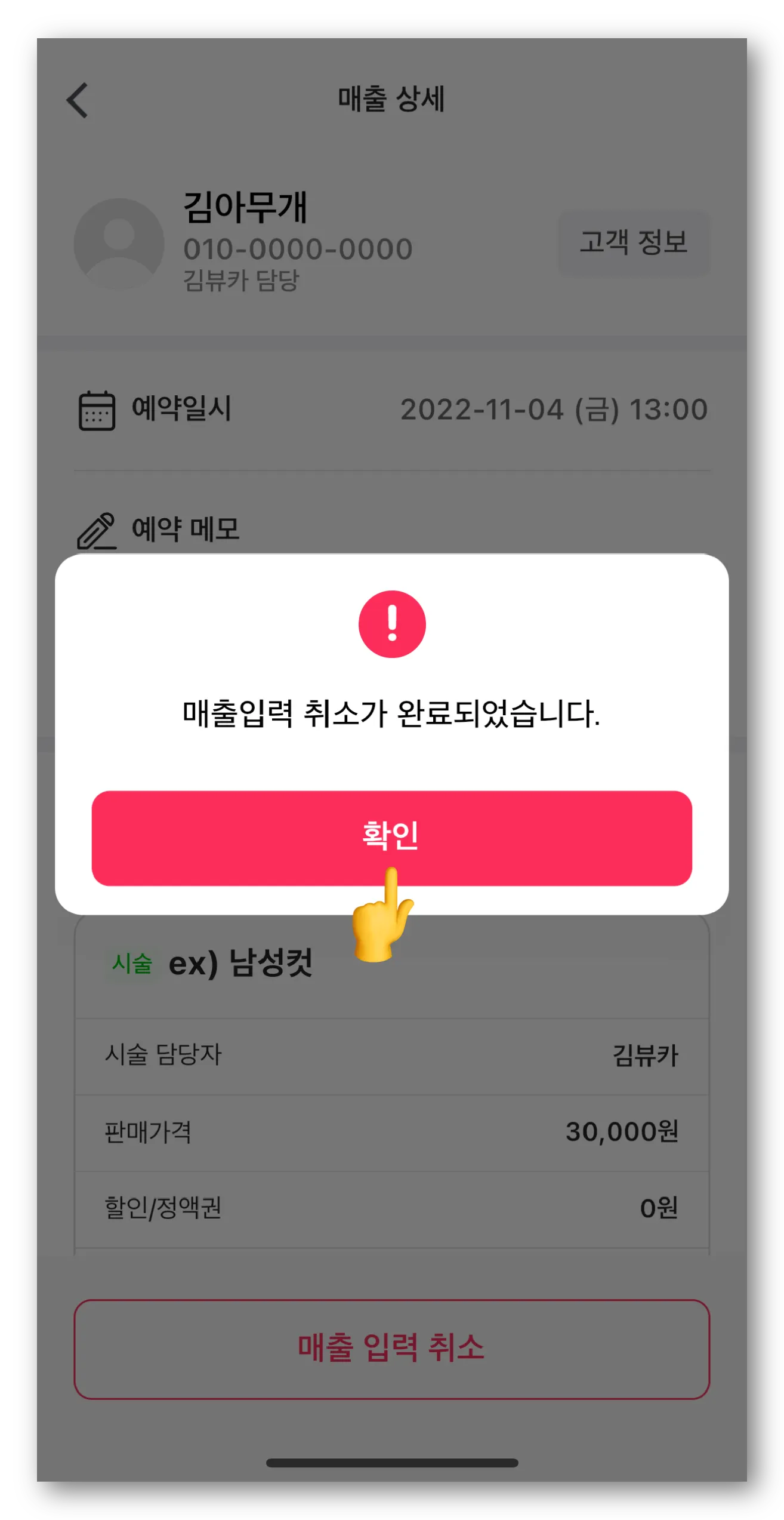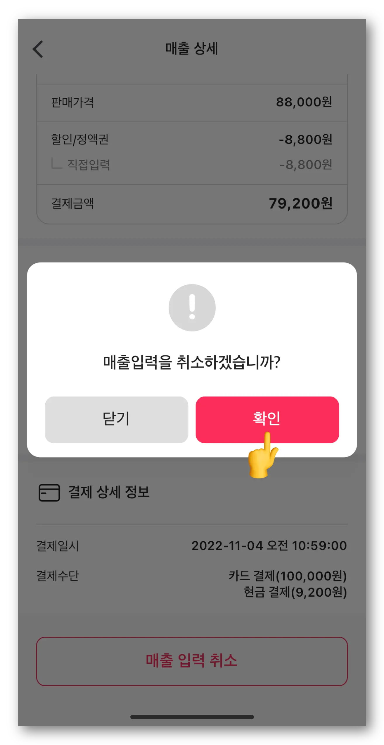 매출 입력 취소 알림에서 ‘확인’ 버튼을 눌러주세요.