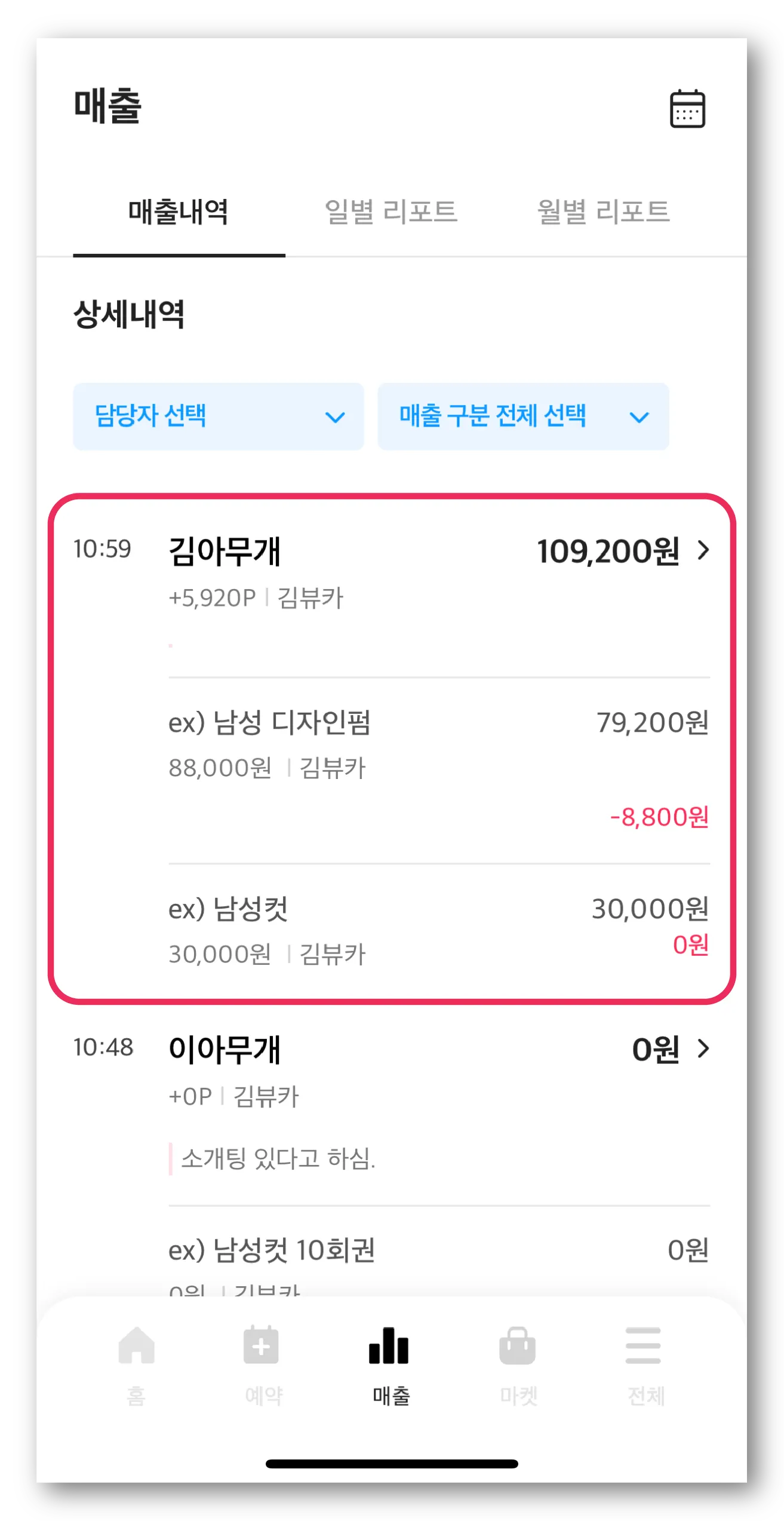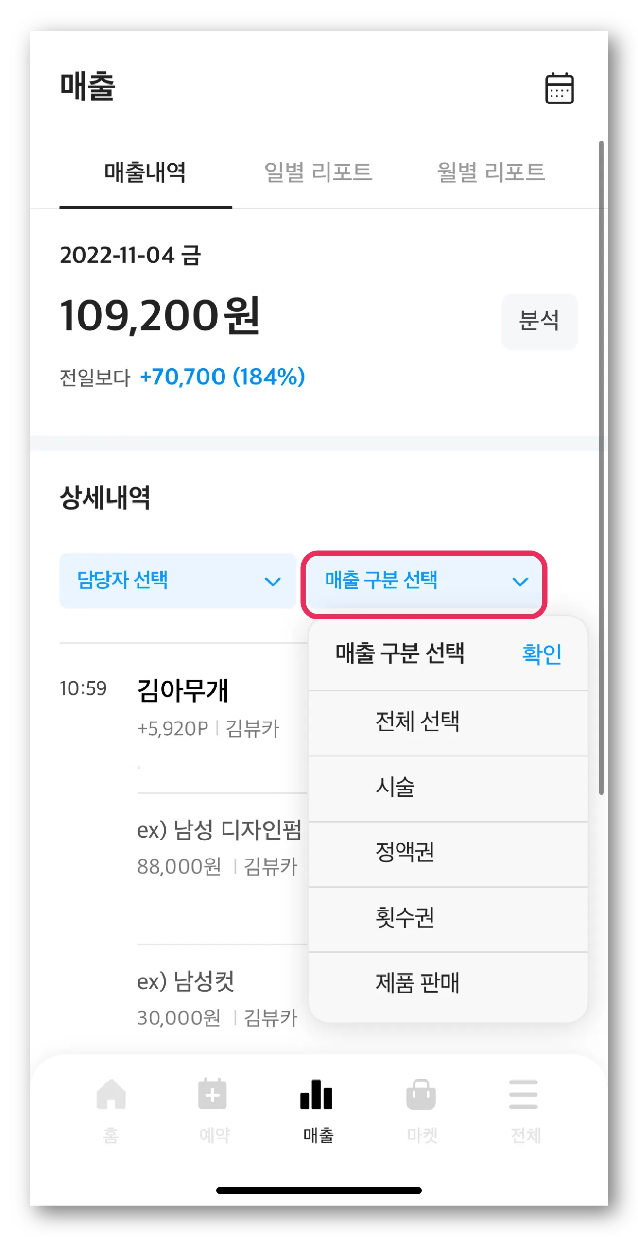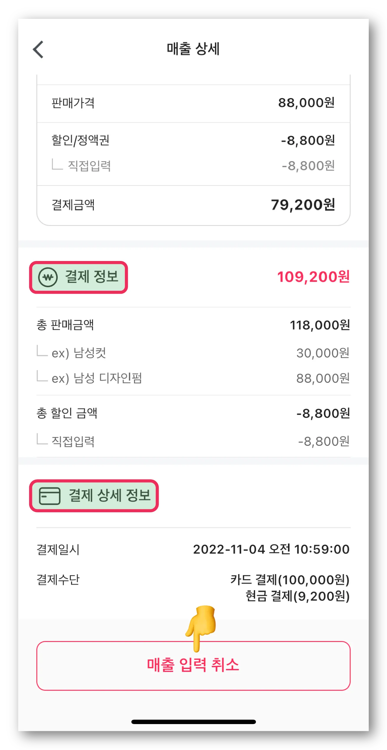 매출 상세 내역에서 시술 내역 및 결제 상세 정보를 확인 후 하단에 ‘매출 입력 취소’ 버튼을 눌러주세요.