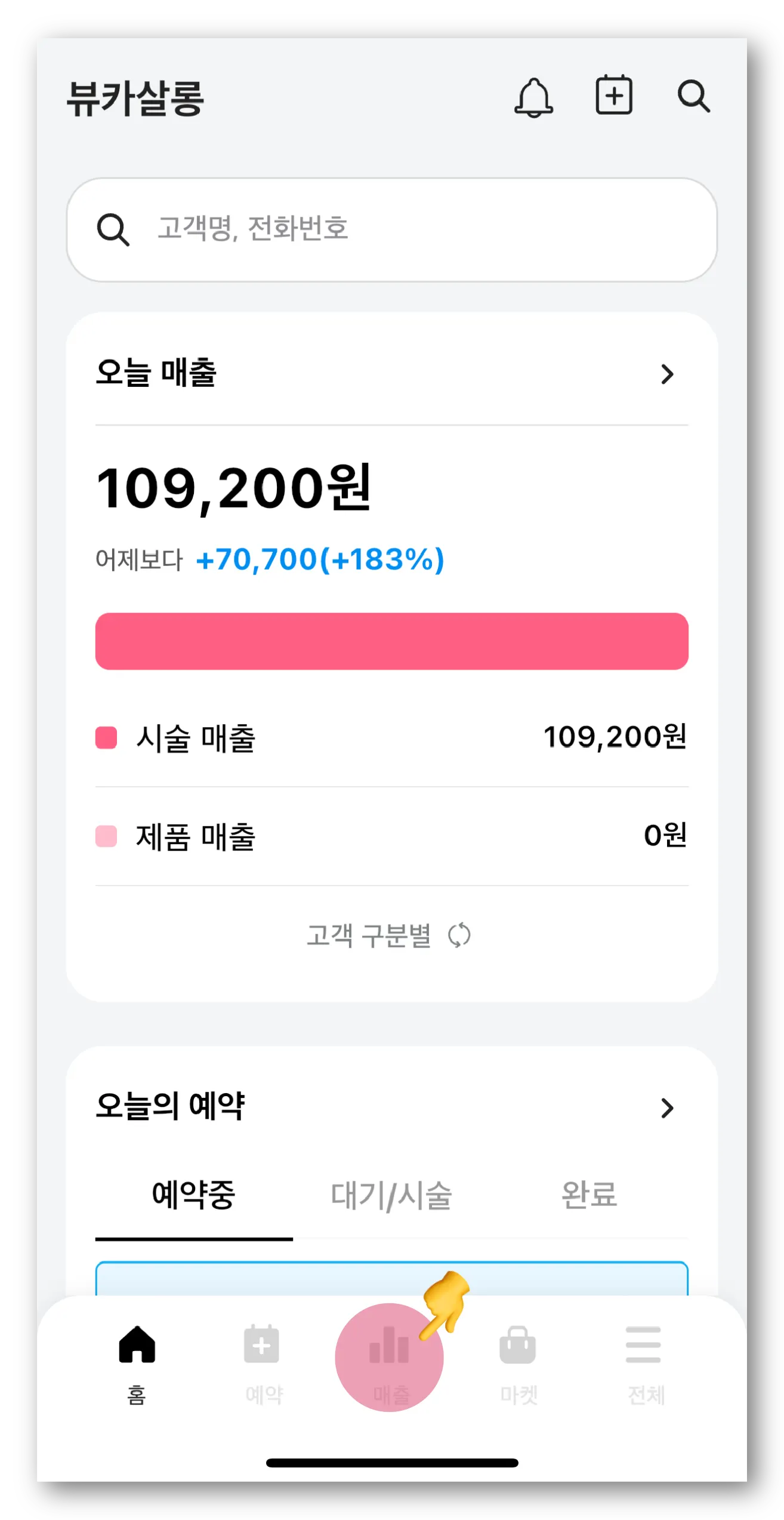 뷰카 앱 실행 후 화면 하단에 ‘매출’ 탭을 눌러주세요.