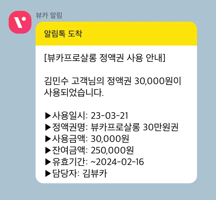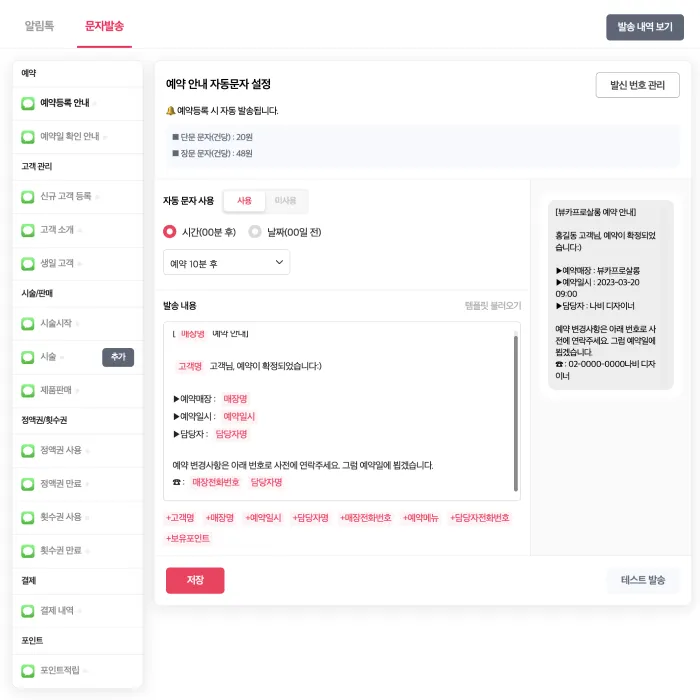 예약 알림, 결제 내역 외에도 시술, 정액권 및 횟수권, 포인트와 관련된 템플릿이 다양하게 추가 되었으며 쉽고 간편하게 설정할 수 있습니다.