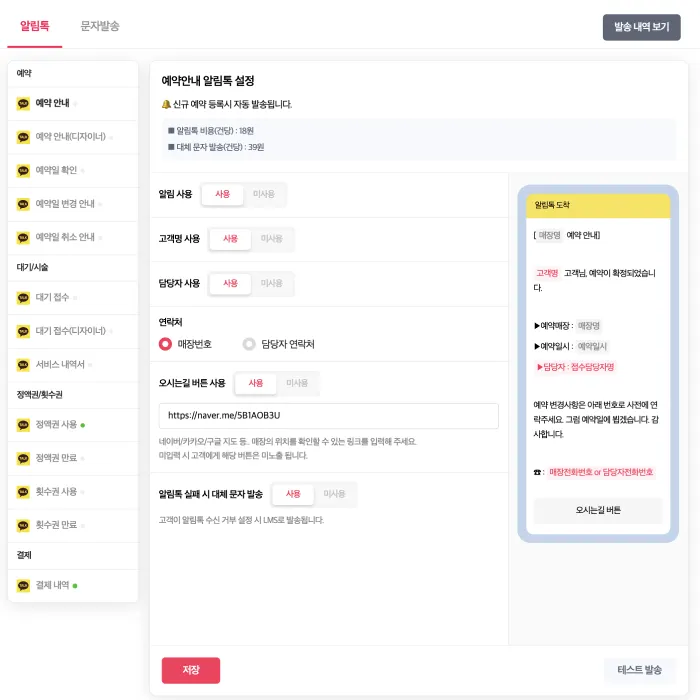 | 자동 알림톡 설정 기능