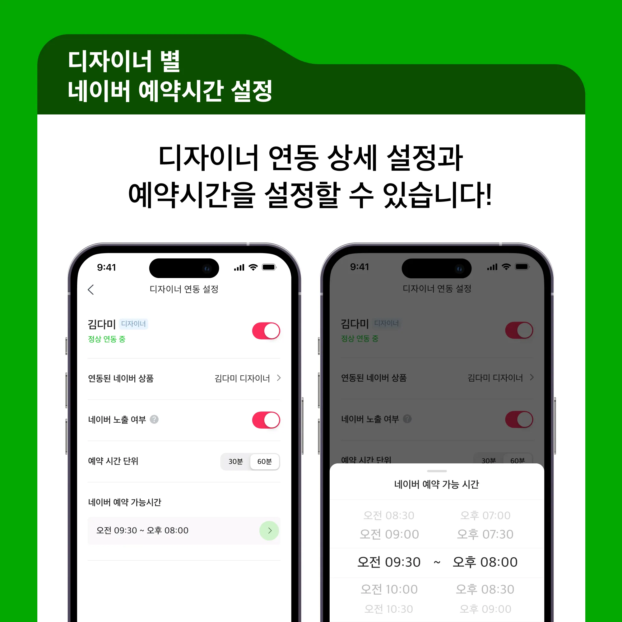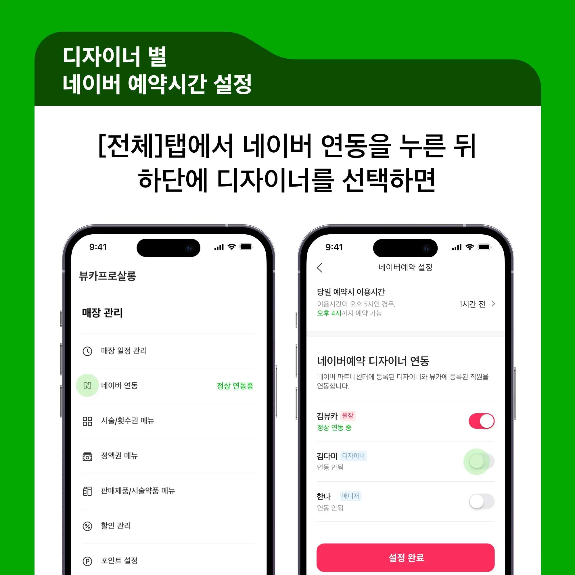 네이버 예약 연동 후 상세 설정 시 디자이너 별로 네이버 예약 시간을 설정할 수 있습니다.
