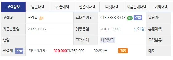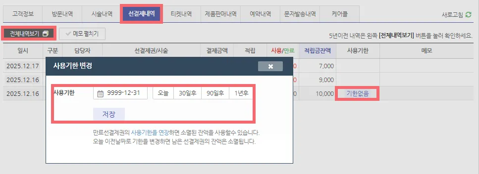 기한 만료된 선결제권 기한 변경 시 고객정보에서 잔액이 다시 표시 됩니다.