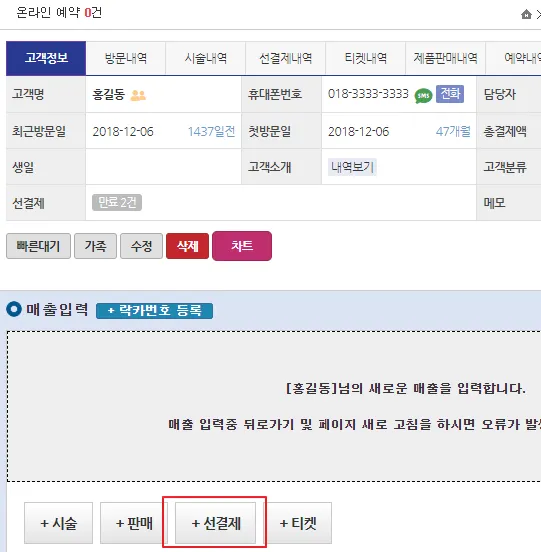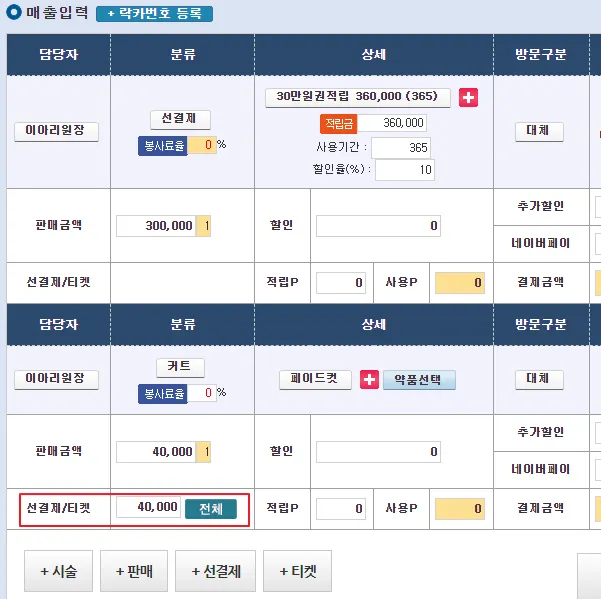 설정 > 시술/횟수권/정액권 > 선결제권 관리