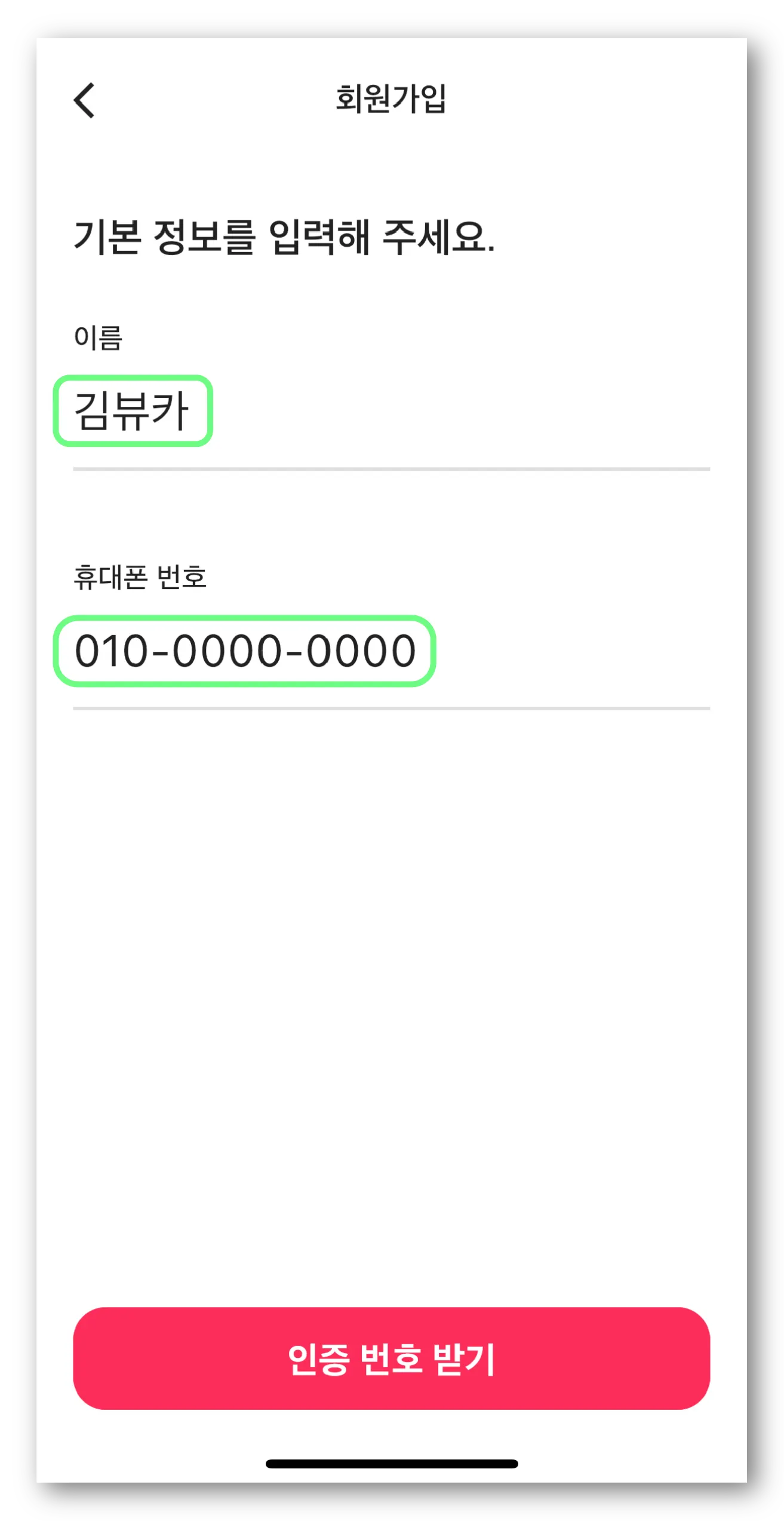 기본 정보 입력 후 ‘인증 번호 받기’를 눌러주세요.