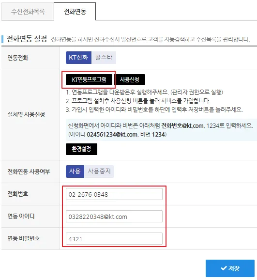 가입완료후 KT에서 알려준 아이디/비밀번호를 설정페이지(예약 > 수신전화목록 > 전화연동)에 입력합니다.