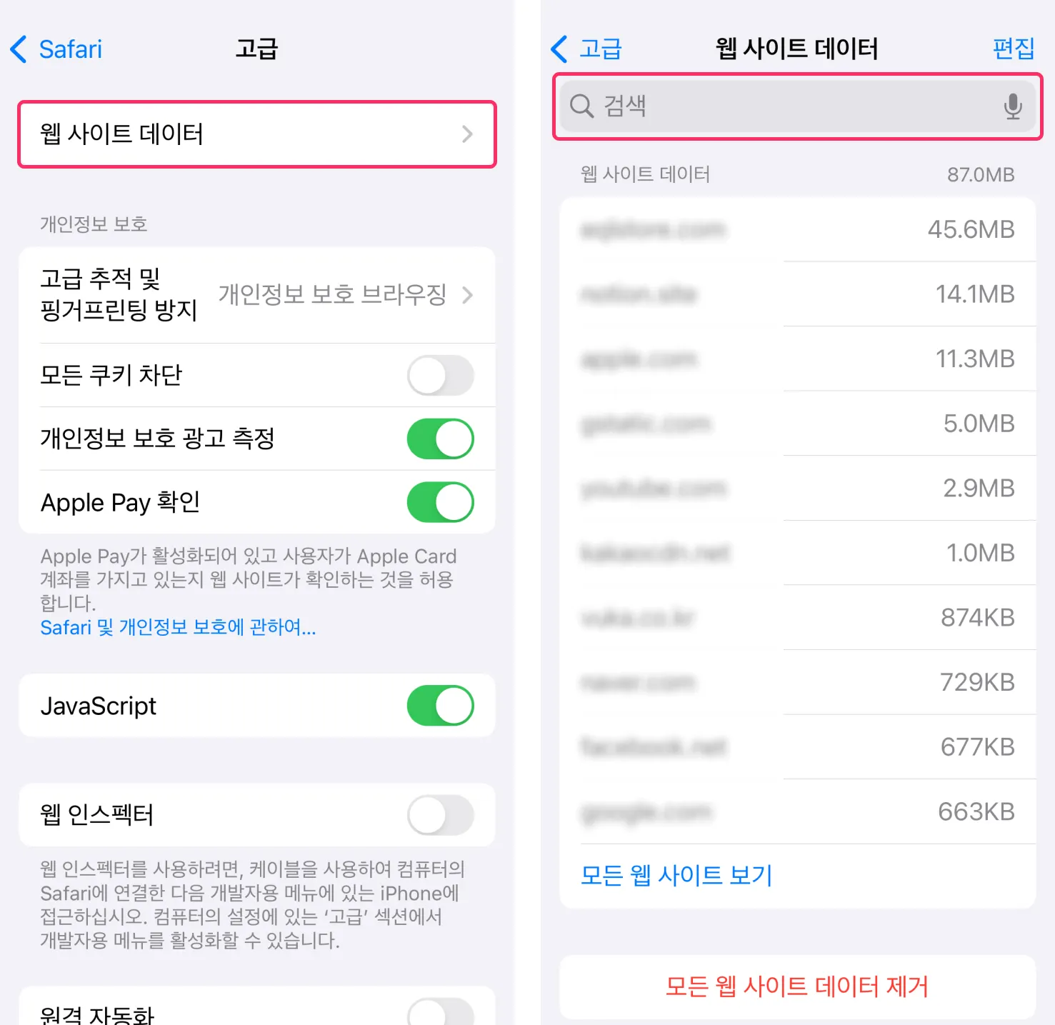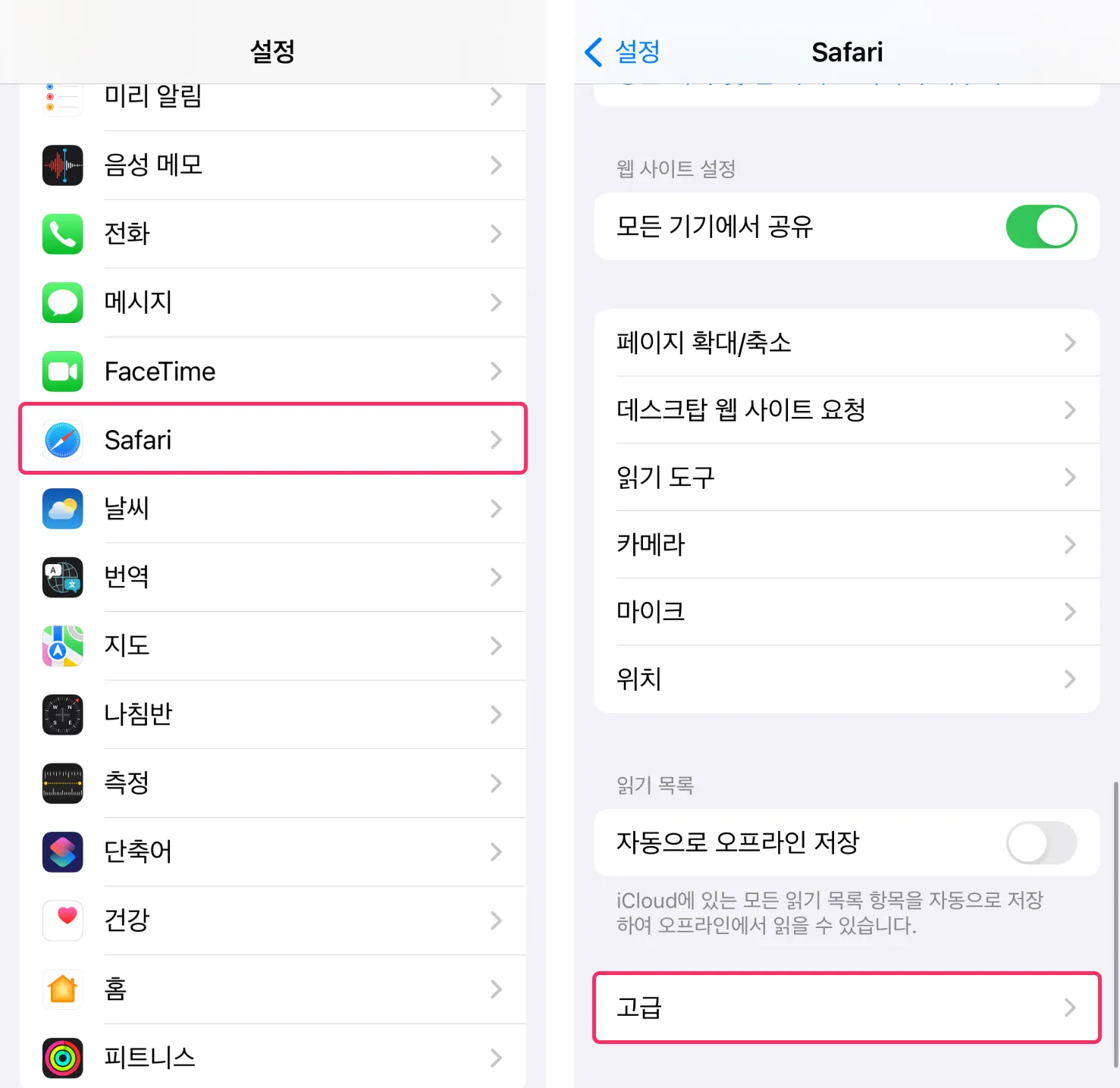 설정 > Safari(사파리)를 선택 후 Safari(사파리) 화면 하단에 고급을 선택해 주세요.