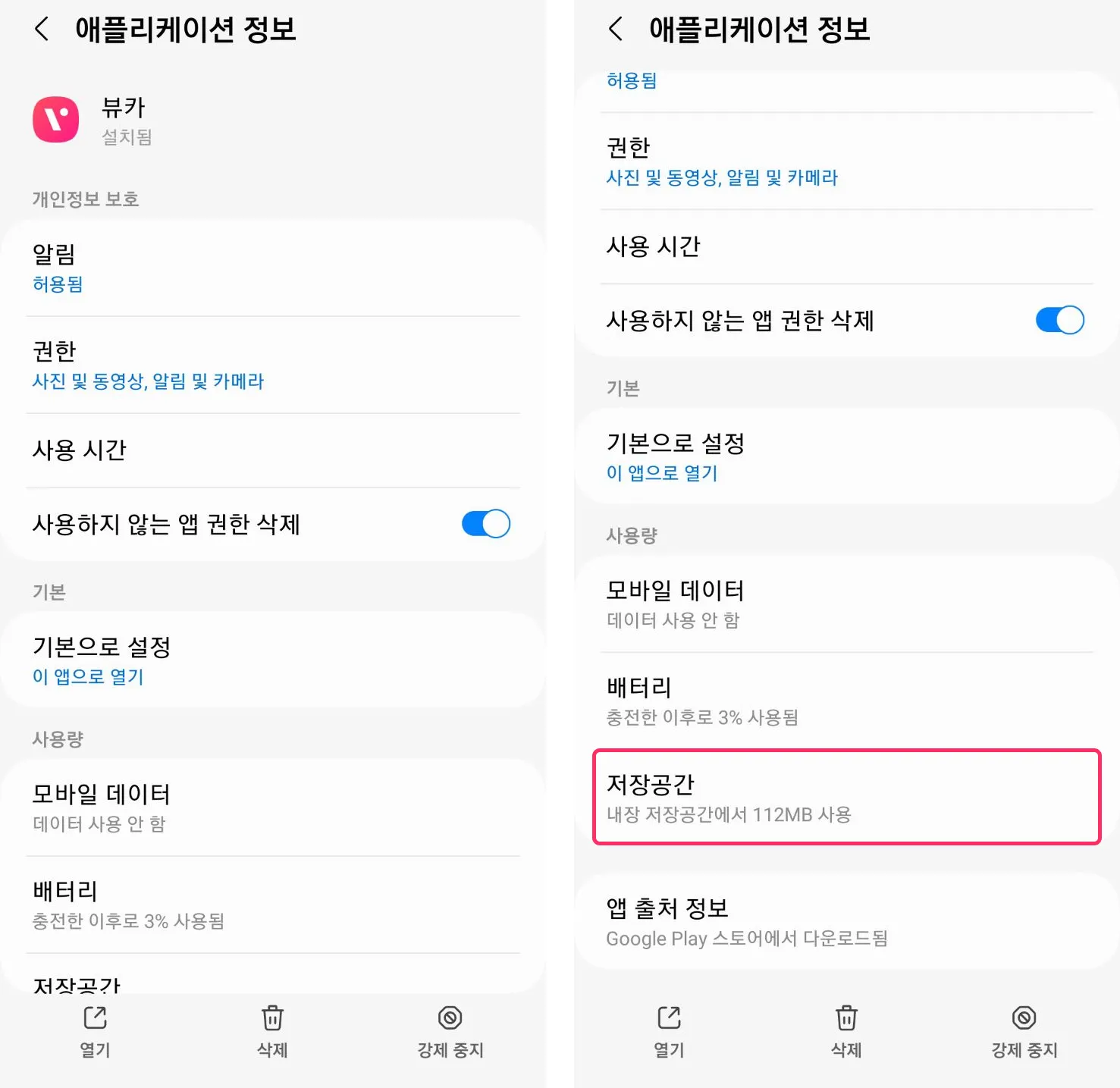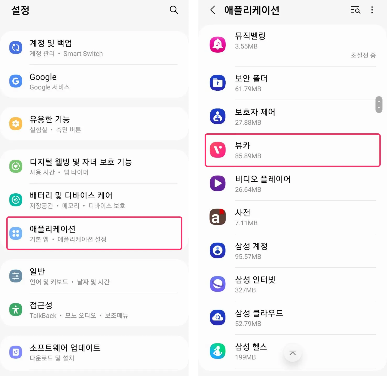 설정 > 애플리케이션 선택 후 뷰카 앱을 선택해 주세요.