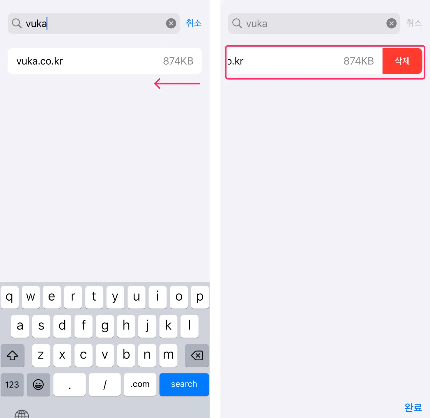 vuka.co.kr 탭을 왼쪽 방향으로 밀어 삭제 버튼을 눌러주세요.