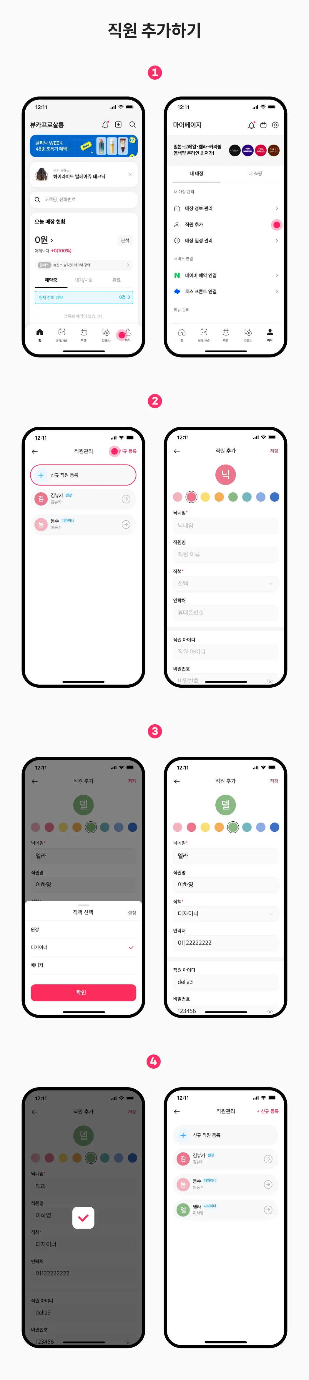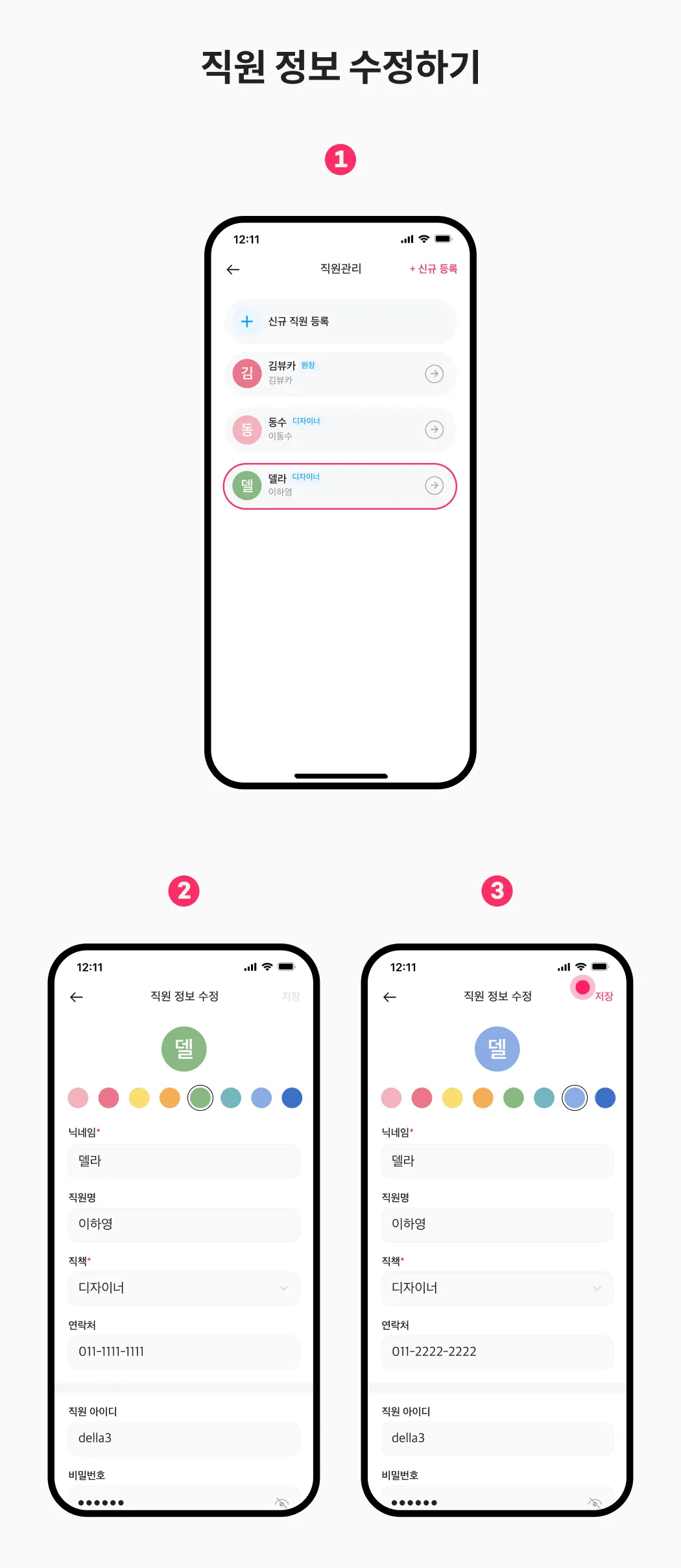 | 직원 관리 화면에서 다음과 같이 진행해 주세요.
