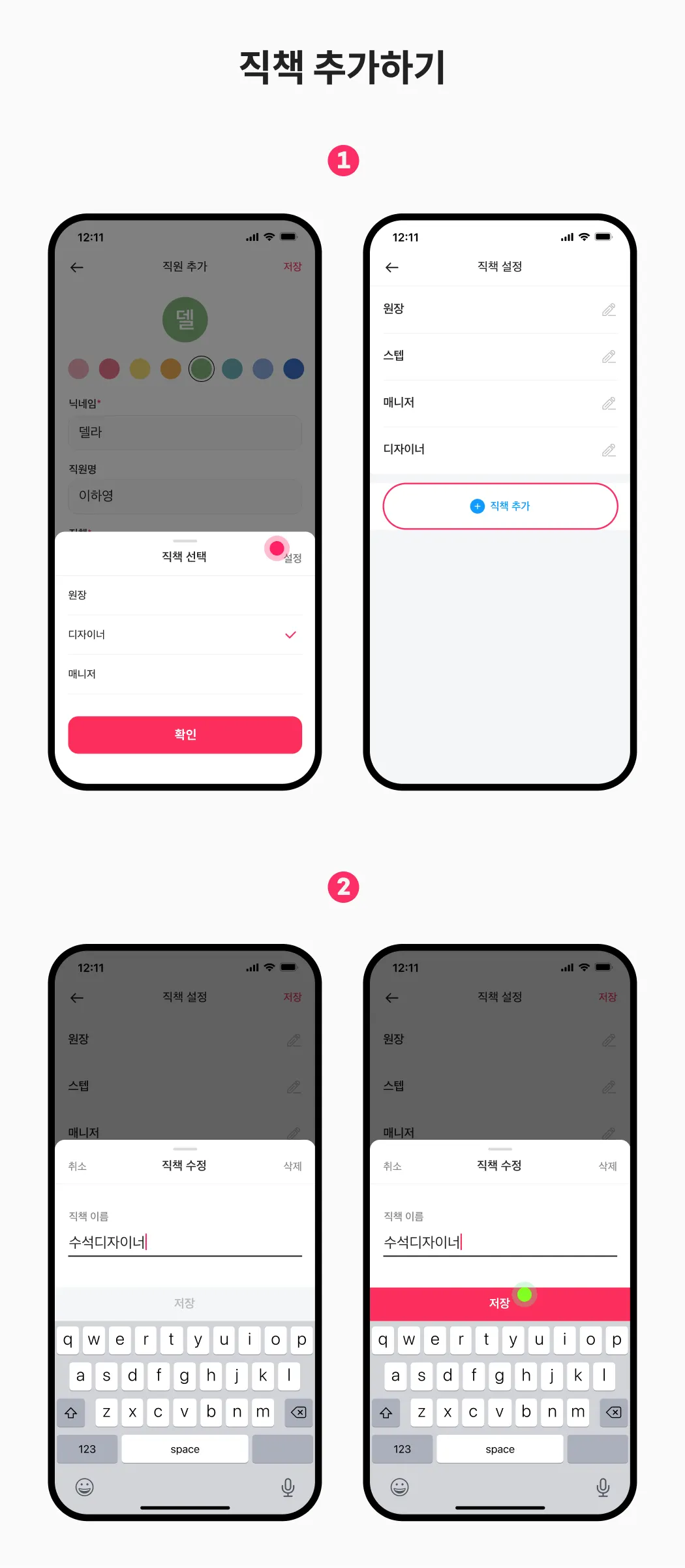 직책 추가 및 수정은 직원 추가 및 수정 시 직책 선택을 누른 후 우측 상단에 설정을 눌러 다음과 같이 추가하고 수정할 수 있습니다.
