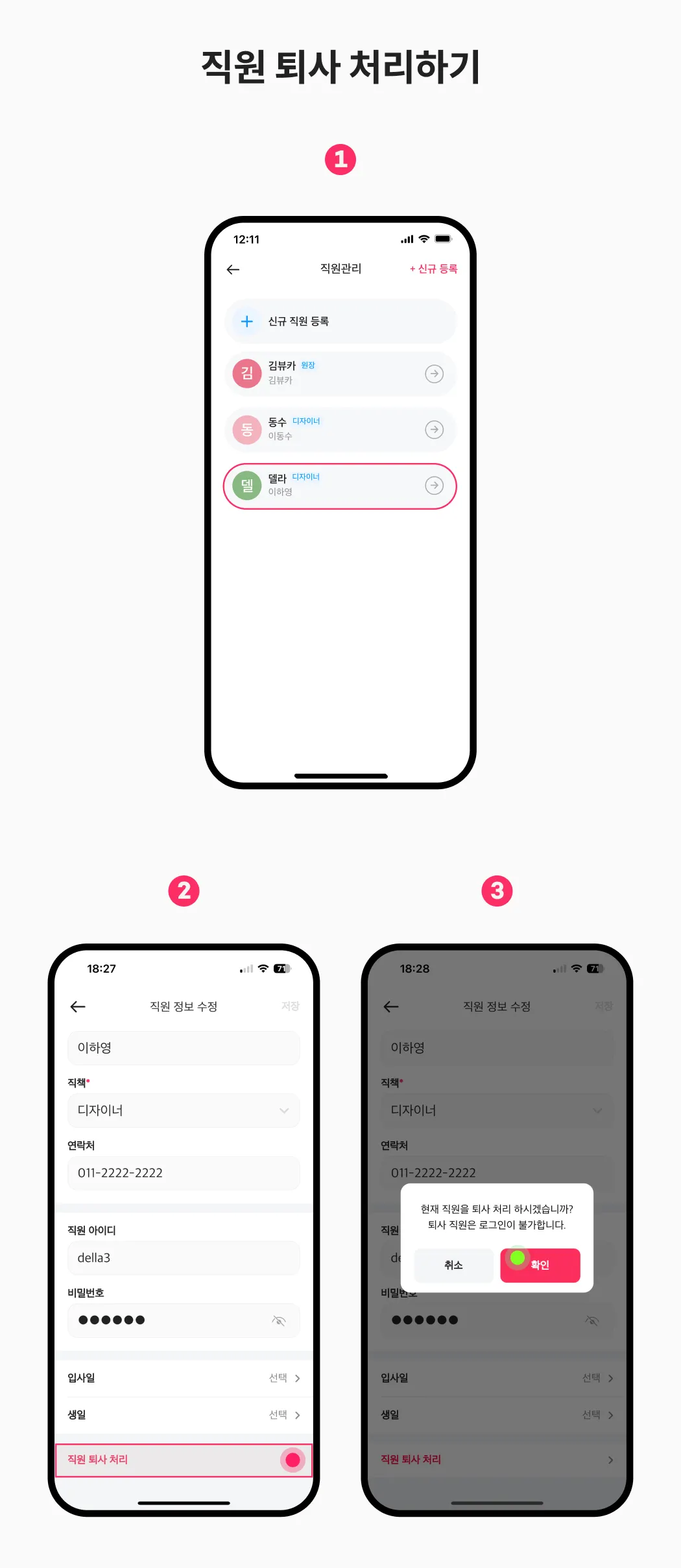 | 직원 관리 화면 > 퇴사할 직원 선택 > 화면을 아래로 내려 ‘직원 퇴사 처리’ 선택 > 확인 버튼