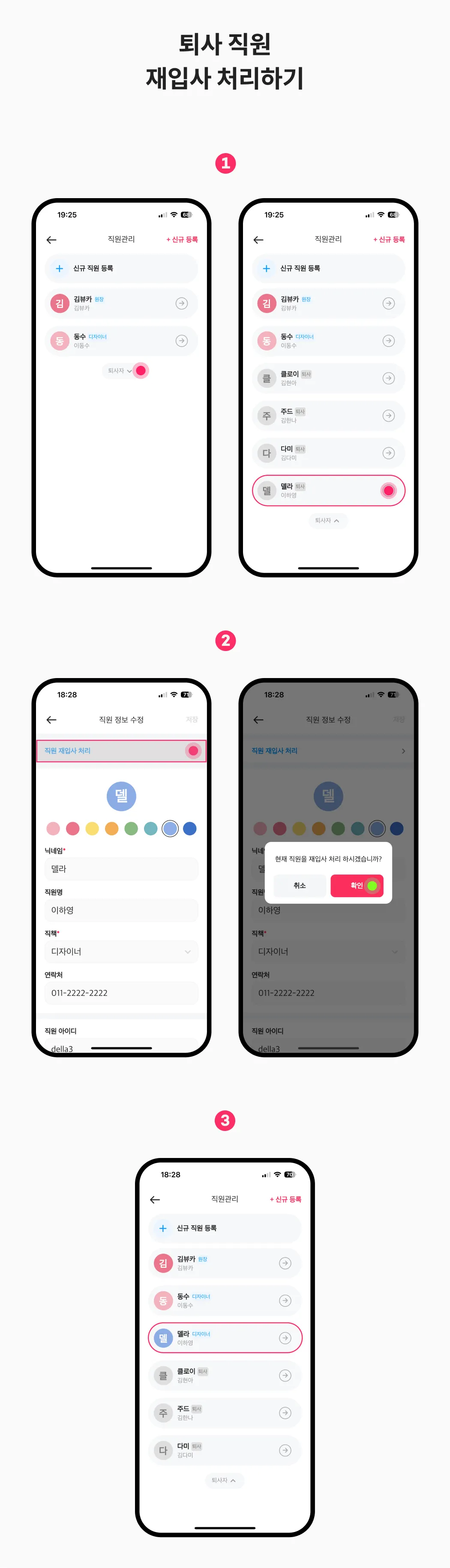 | 직원 관리 화면 내 ‘퇴사자’ 버튼 선택 > 재입사 처리할 직원 선택 > 화면 상단에 ‘직원 재입사 처리’ 선택 > 확인 버튼
