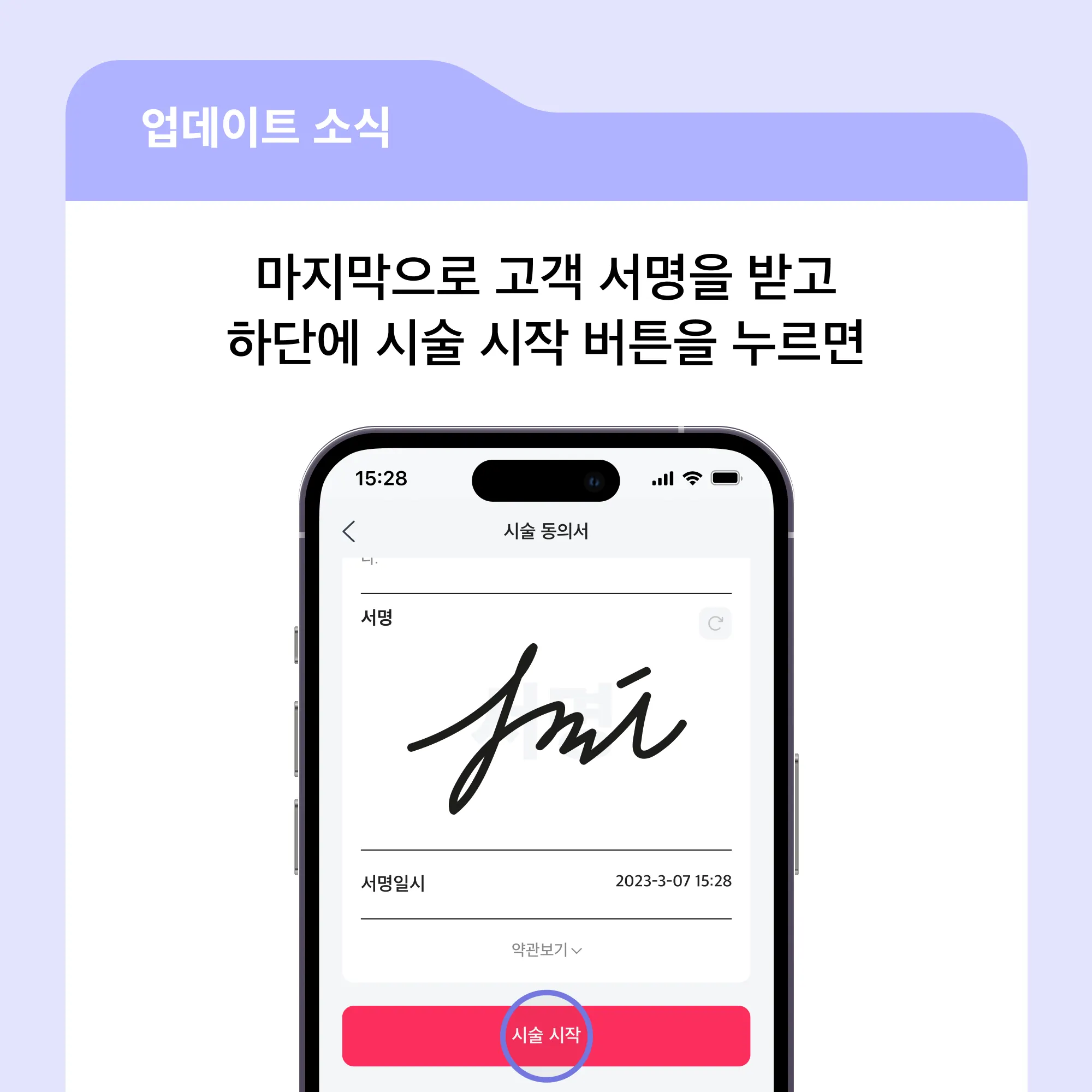 마지막으로 고객의 서명을 받고 하단에 시술 시작 버튼을 누르면 시술 동의서 작성이 완료됩니다.