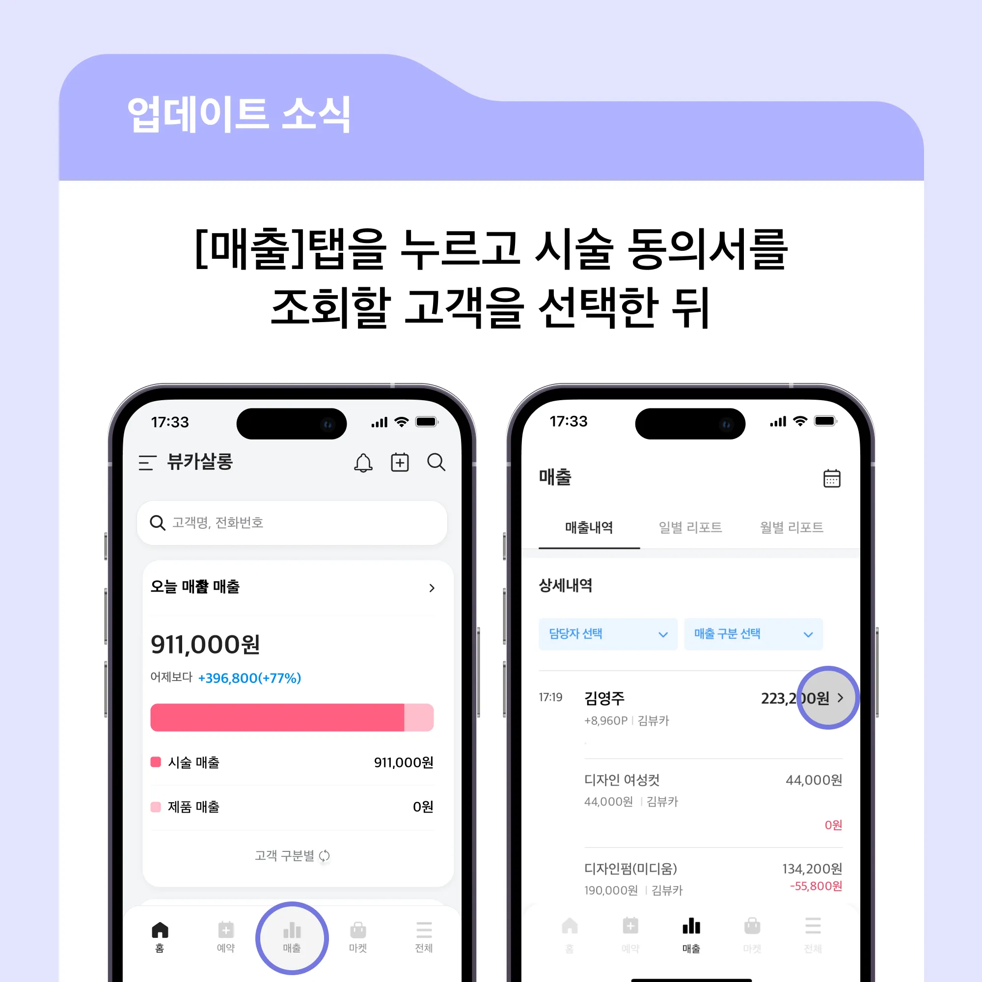 [매출]탭을 누르고 시술 동의서를 조회할 고객을 선택한 뒤