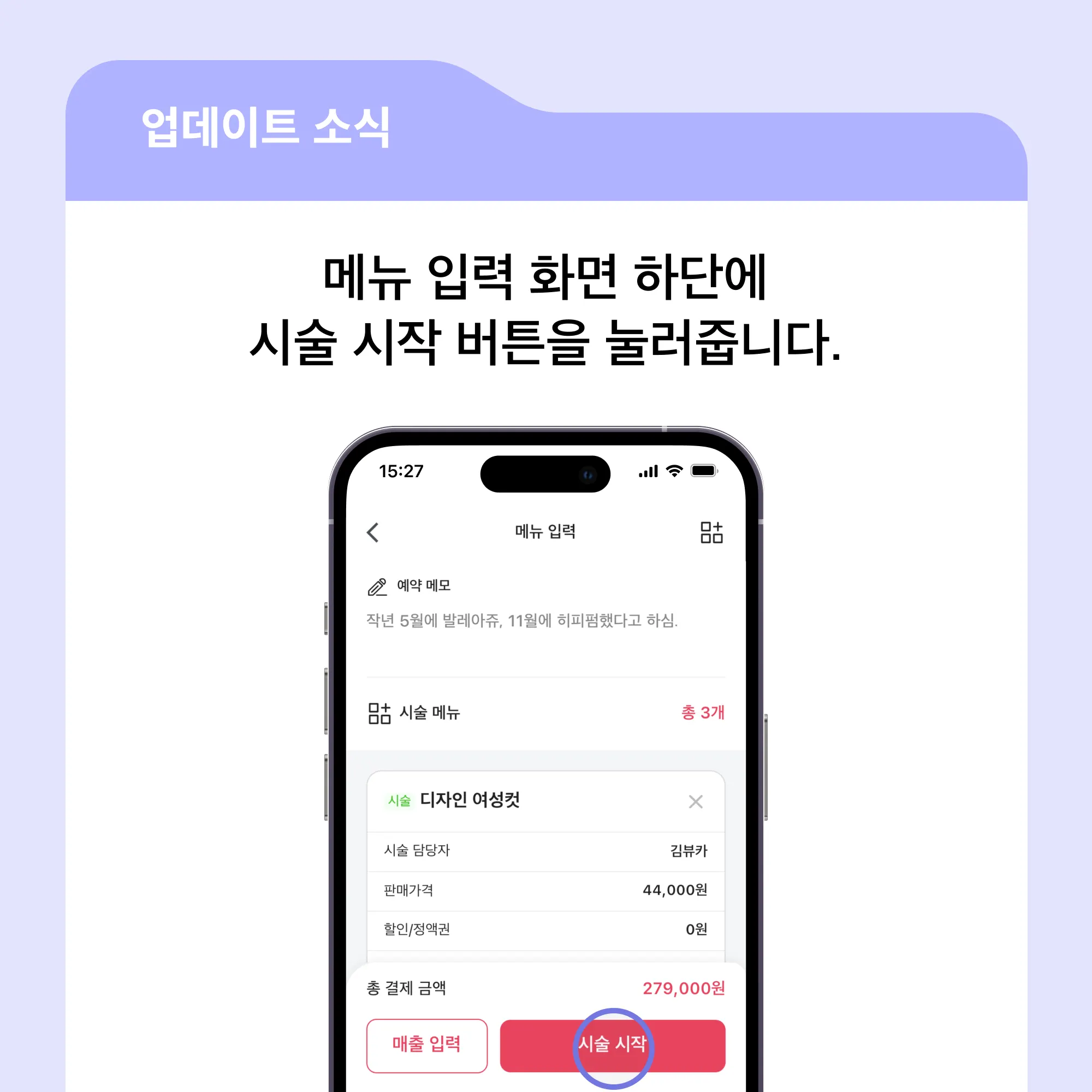 메뉴 입력 화면 하단에 시술 시작 버튼을 눌러줍니다.