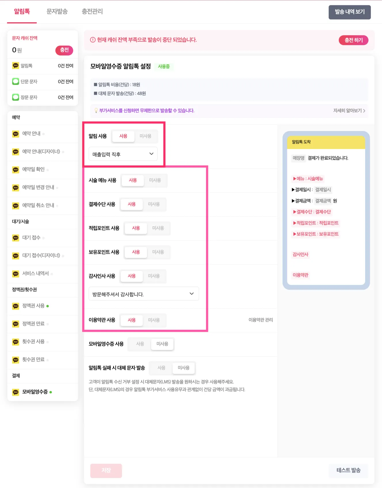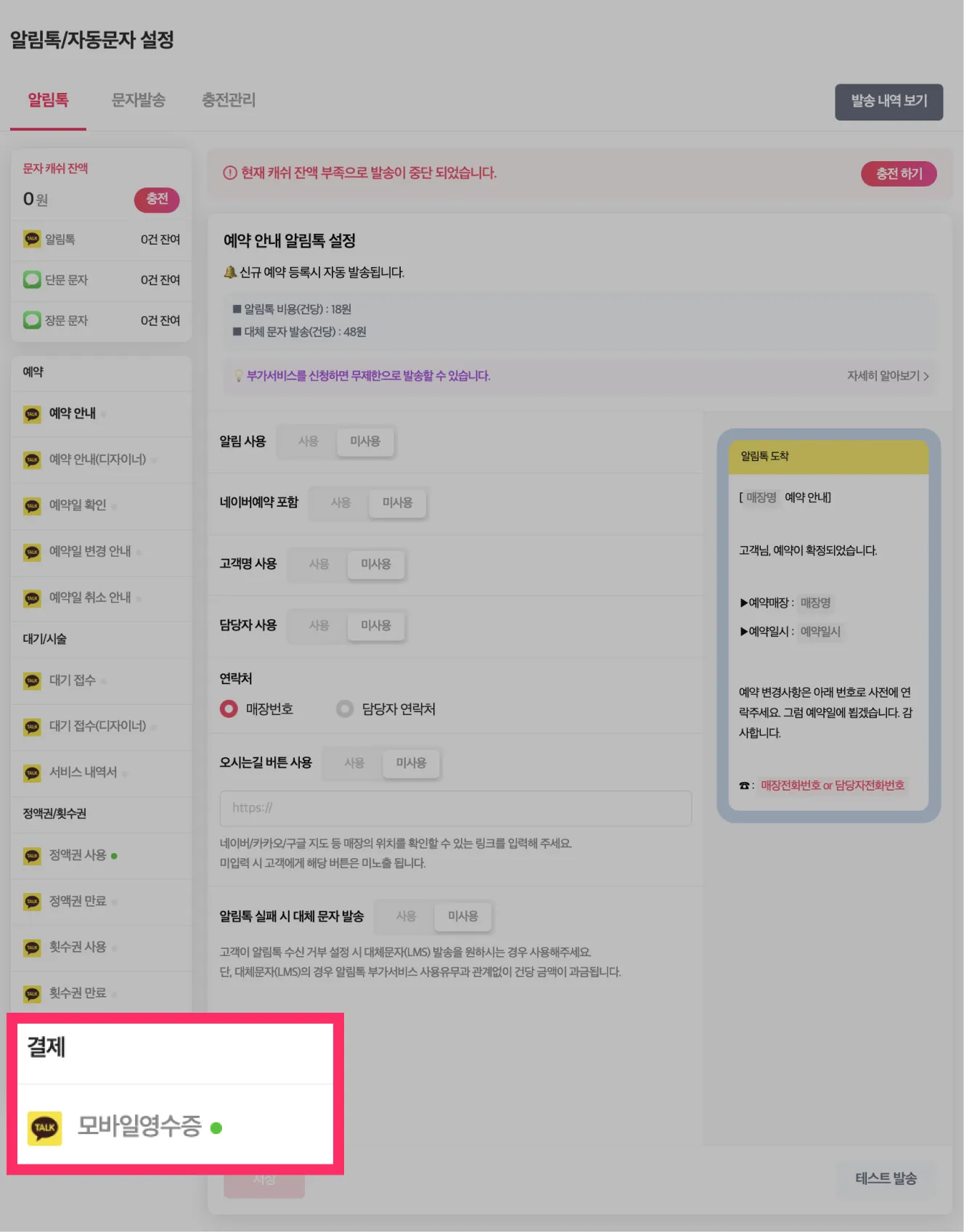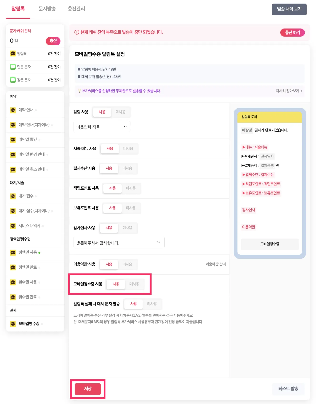 알림톡/자동문자 설정 화면 내 하단에 모바일 영수증을 클릭해 주세요.