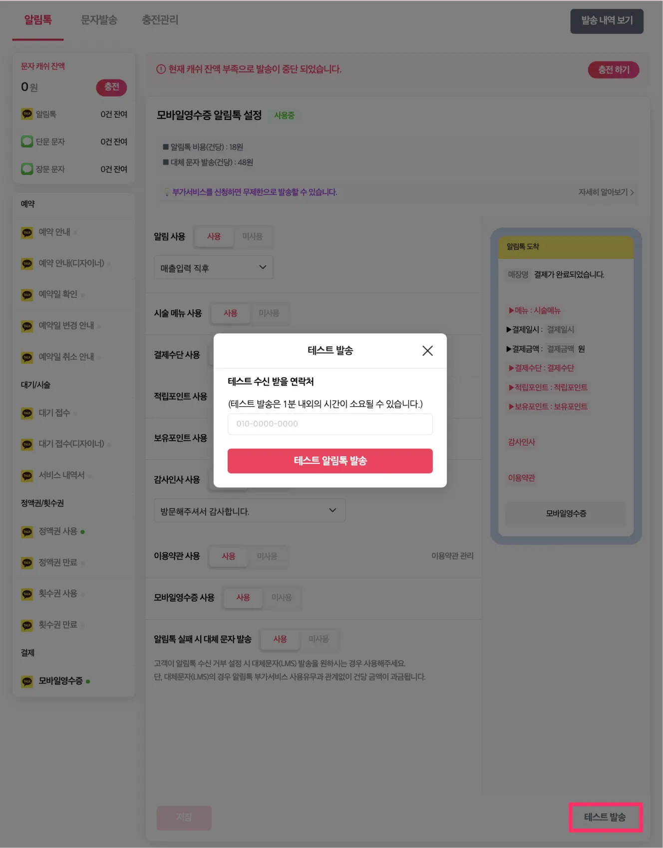 우측 하단에 테스트 발송을 누르면 고객에게 발송되는 알림톡을 확인할 수 있습니다.