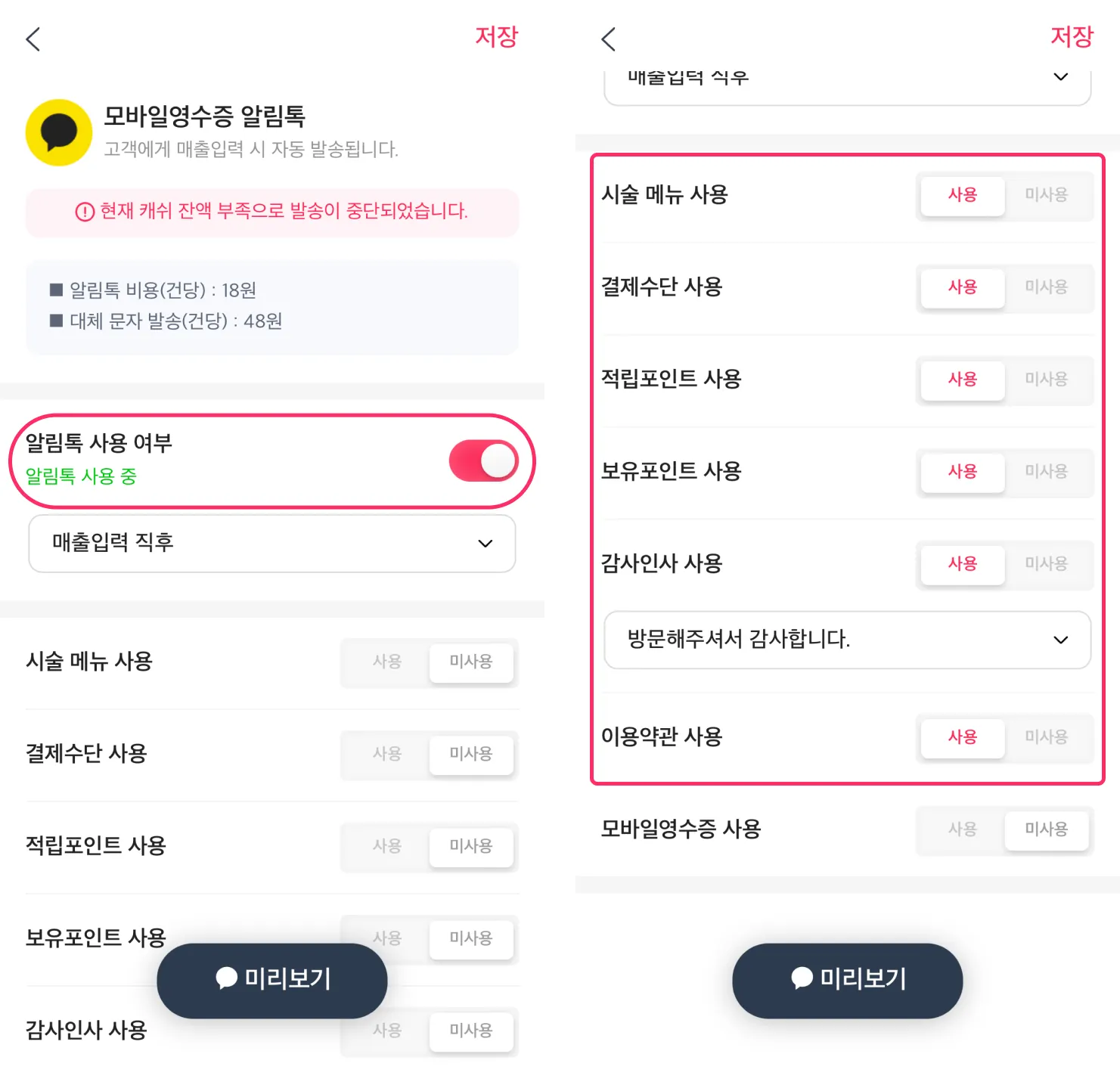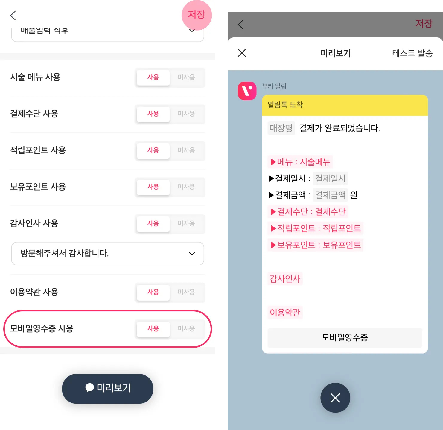 • 하단 미리보기를 선택 시 고객에게 전송되는 모바일 영수증을 미리 확인할 수 있습니다.