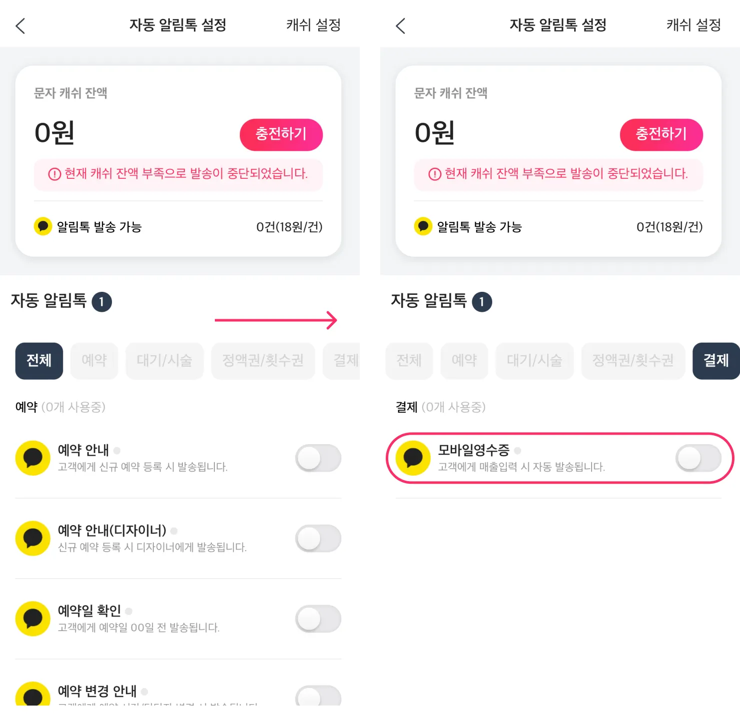 자동 알림톡 설정 화면에서 결제 탭으로 이동 후 모바일 영수증을 선택
